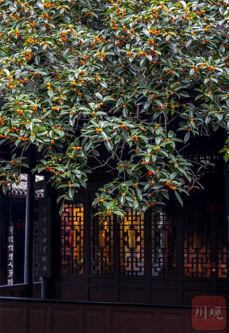 祠内桂树繁多,尤其是启贤堂前600多岁的金桂,堪称三苏祠的“桂中元老”。微风拂过,千万片金桂花瓣簌簌飘落,如同下了一场“黄金雨”。