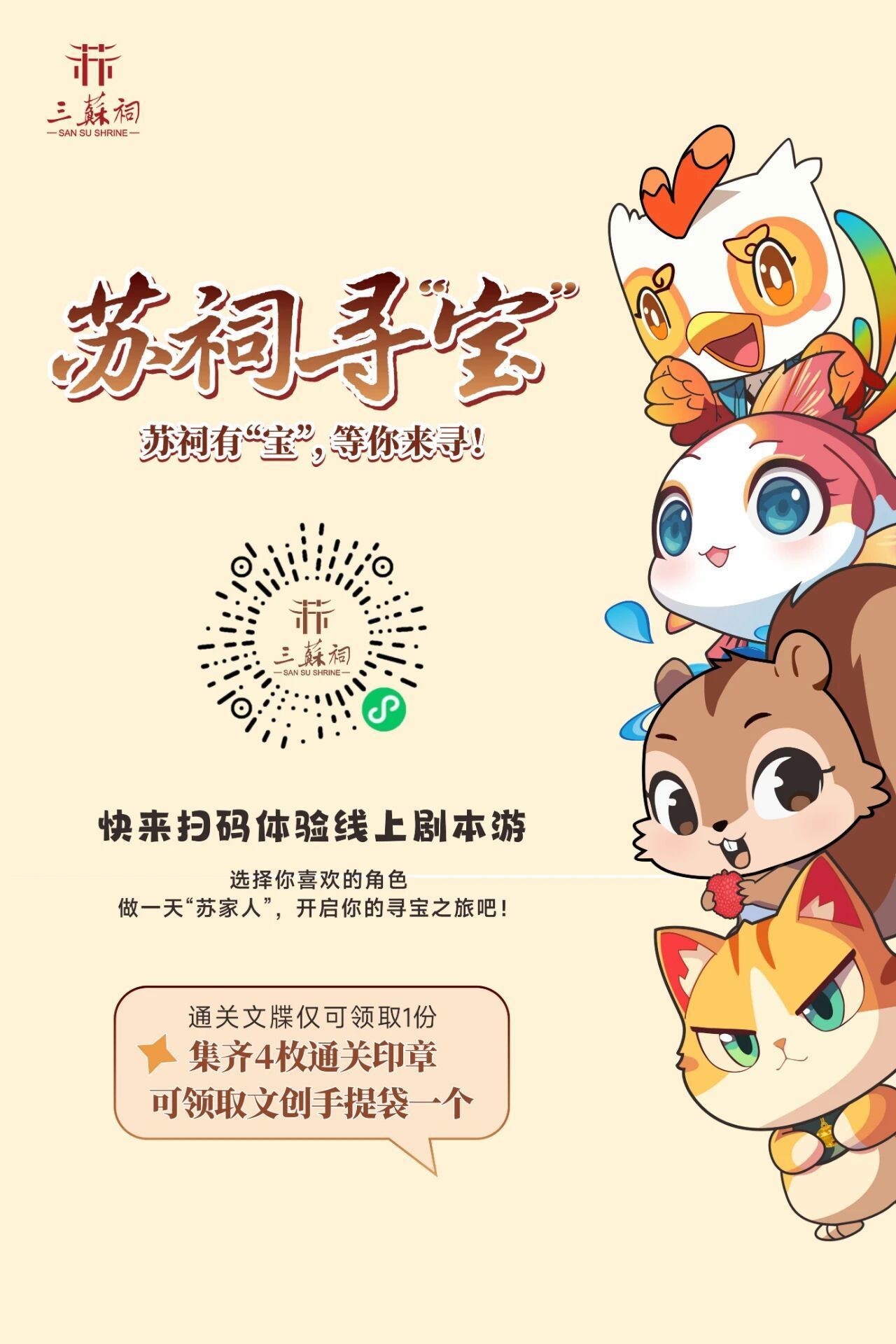 特设“苏祠寻宝”专场,扫码进入选择“角色”,积累一定数量的金币后可领取通关文牒一份,并加盖“通关”印章。集齐4枚“通关”印章即可兑换奖品。