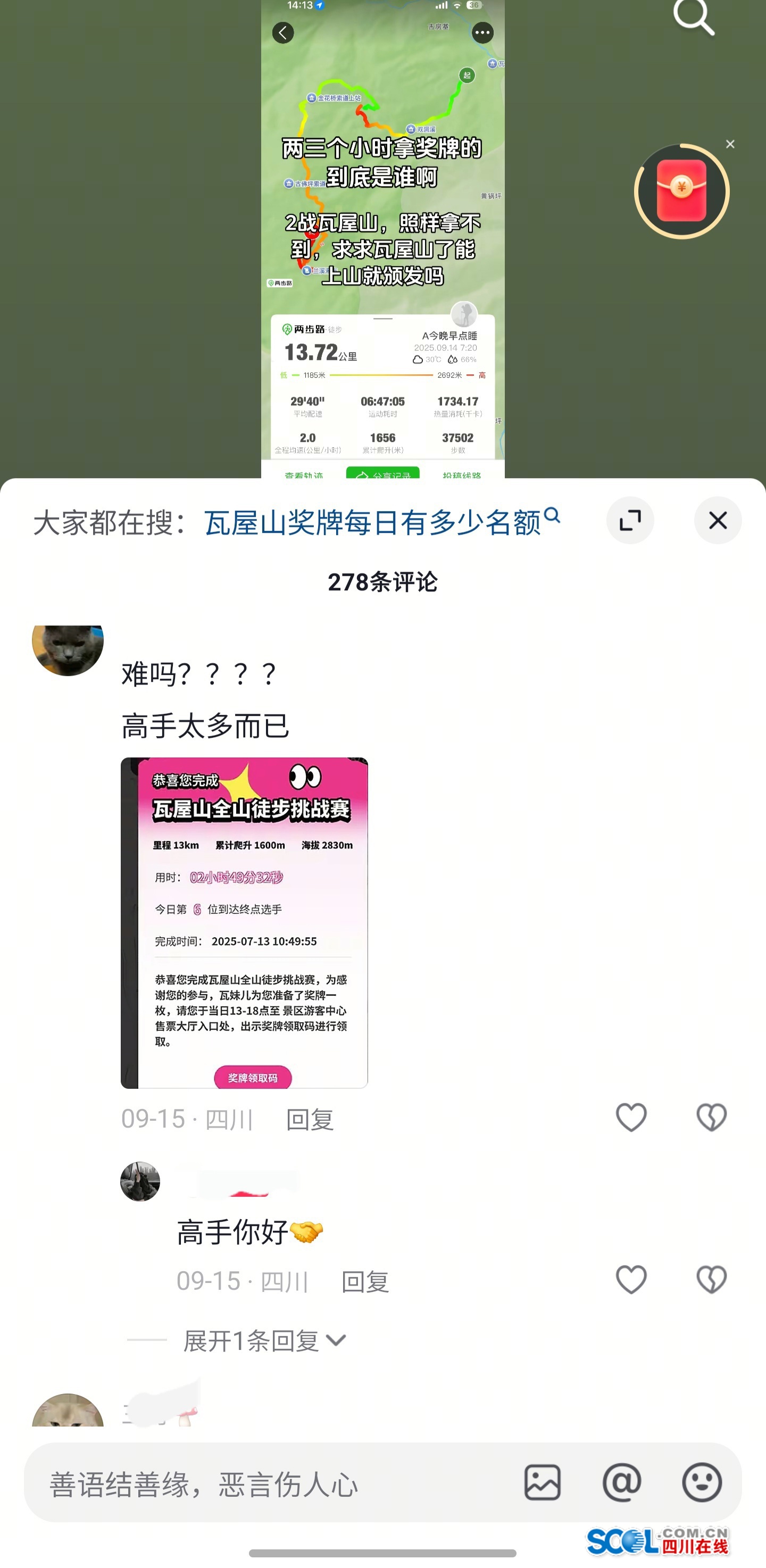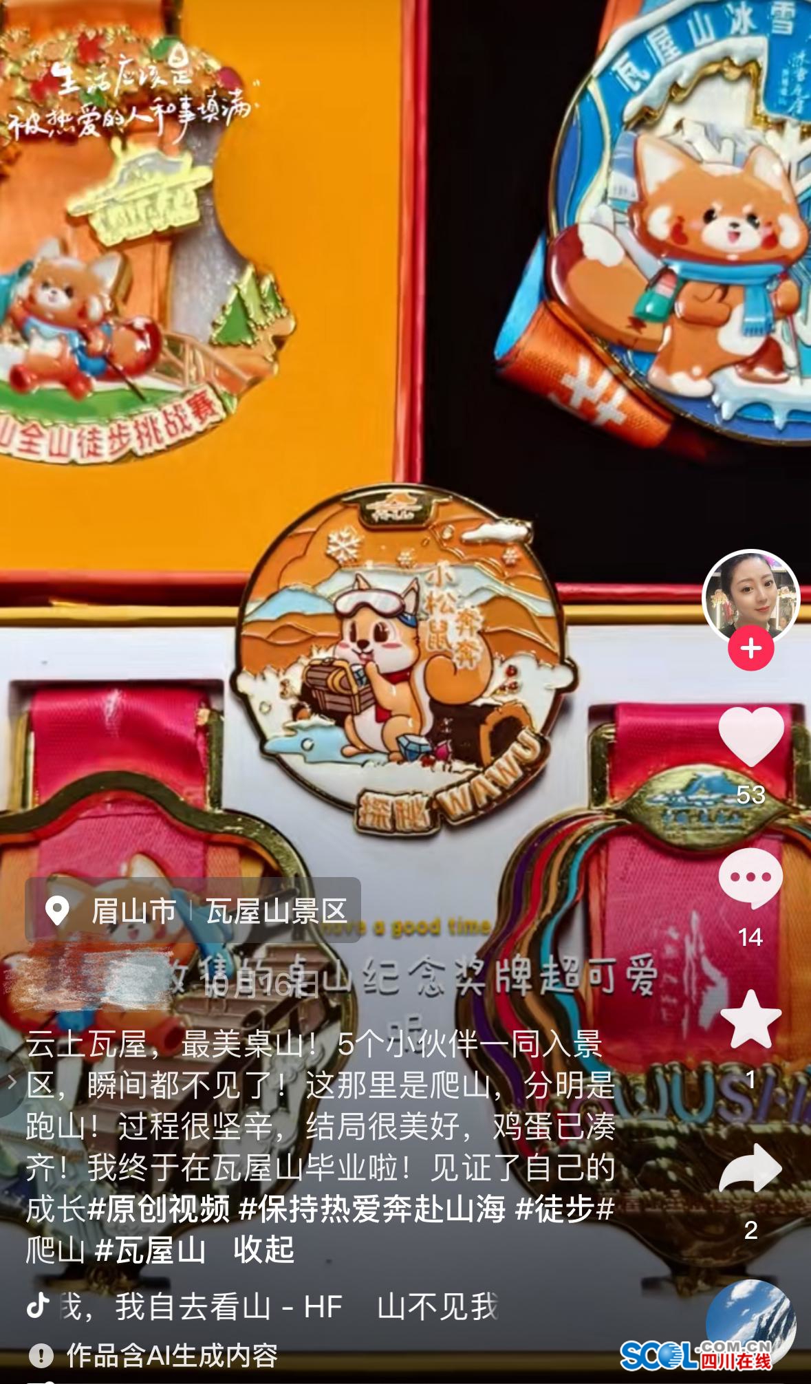 攻略、路线、时间安排……热心网友们自发分享着“夺牌秘籍”:“走B线,少3公里”“千万别周末去,有人凌晨就开始爬”“双人+天气不好+工作日,几率更大”……如今,抖音“瓦屋山奖牌”话题播放量已突破800万。