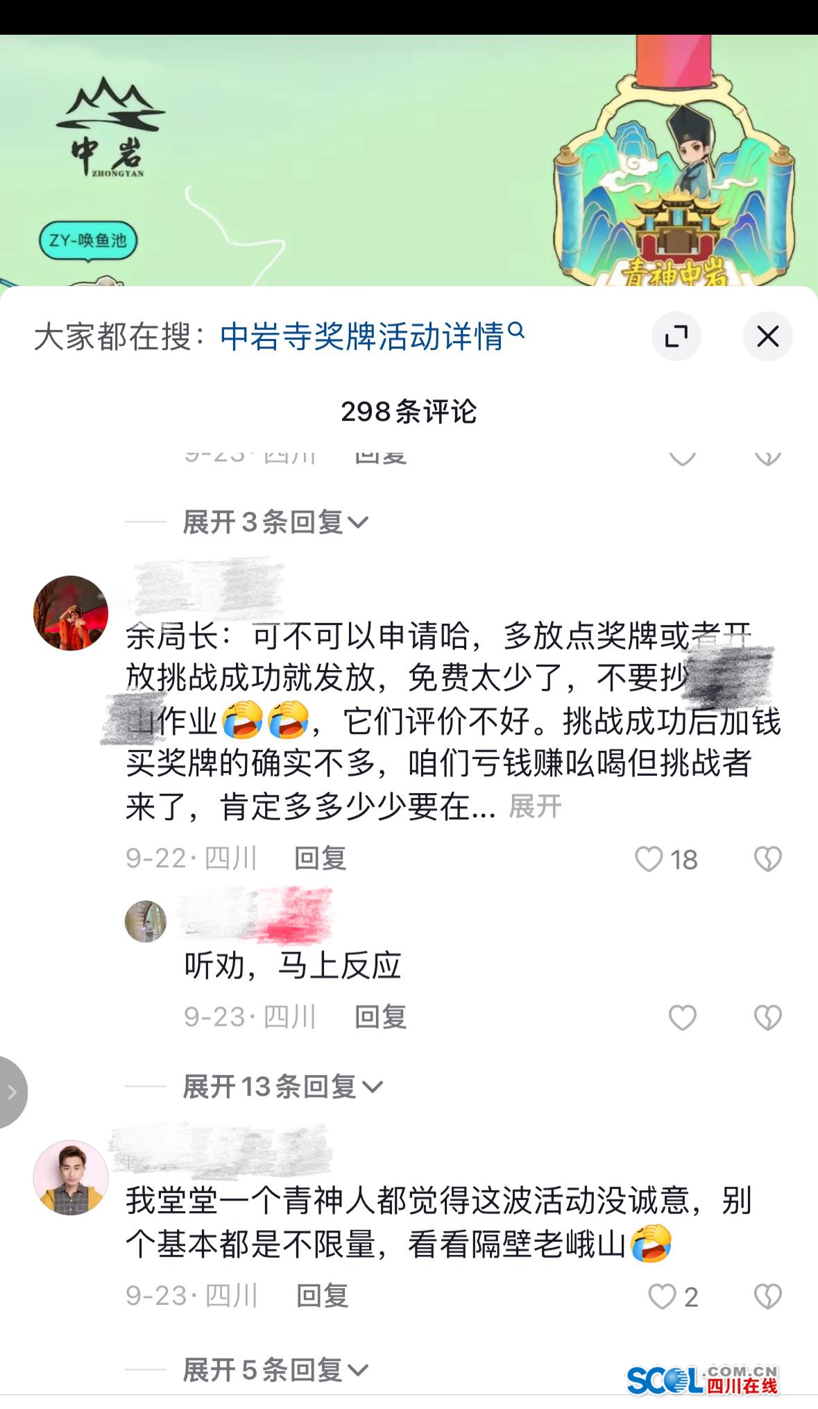 青神县中岩寺周末限前300名免费发奖牌,让网友严重“不满”,网友直接在县文广旅局局长余瑶的抖音下提要求:“余局长,可不可以申请哈,多放点奖牌,学习隔壁老峨山。”