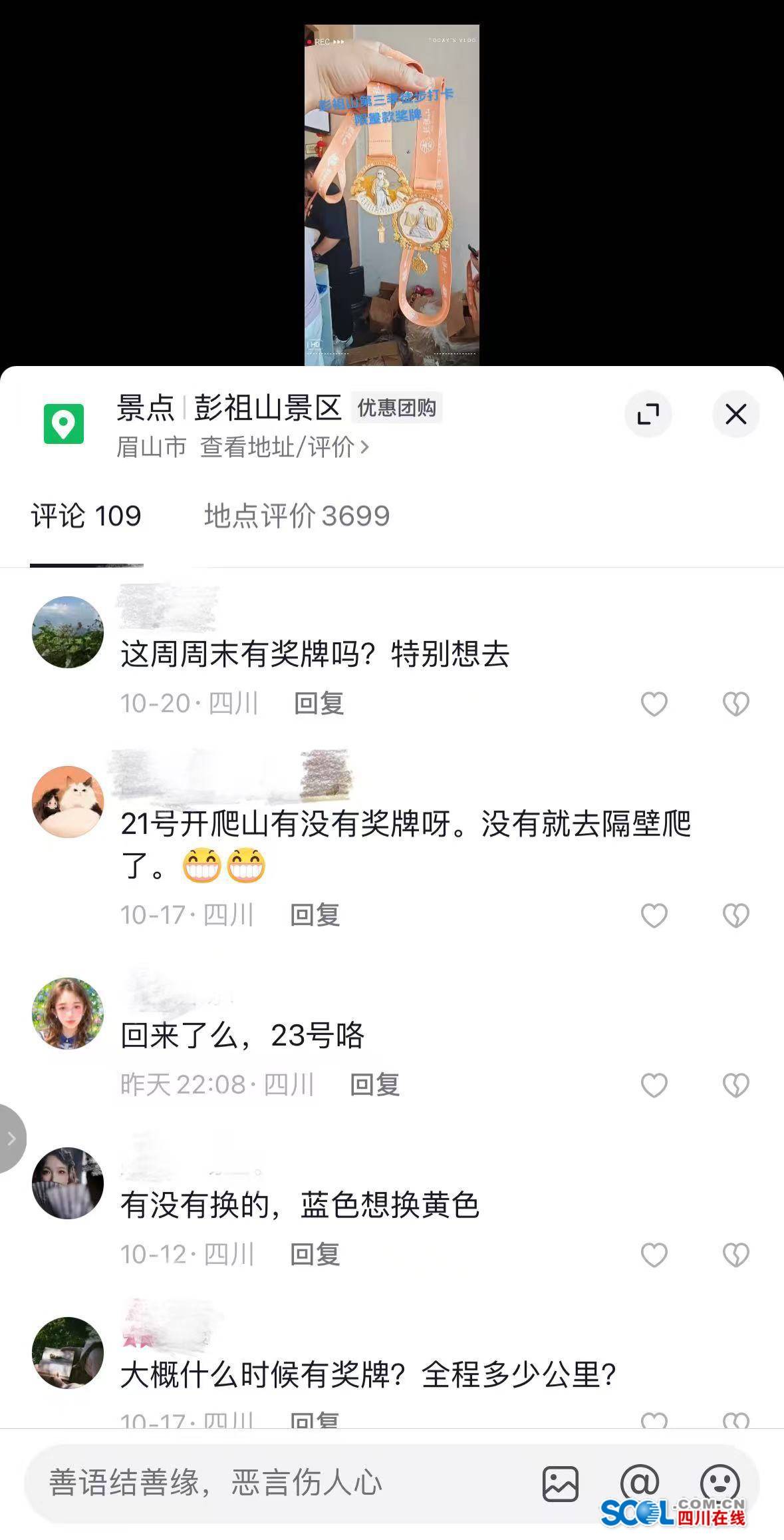 彭山区彭祖山景区官方抖音的评论区里,最新限量款奖牌预告下满是“灵魂拷问”:“10月21号确定有奖牌吗?没有我就去隔壁了”——奖牌已直接左右游客行程。