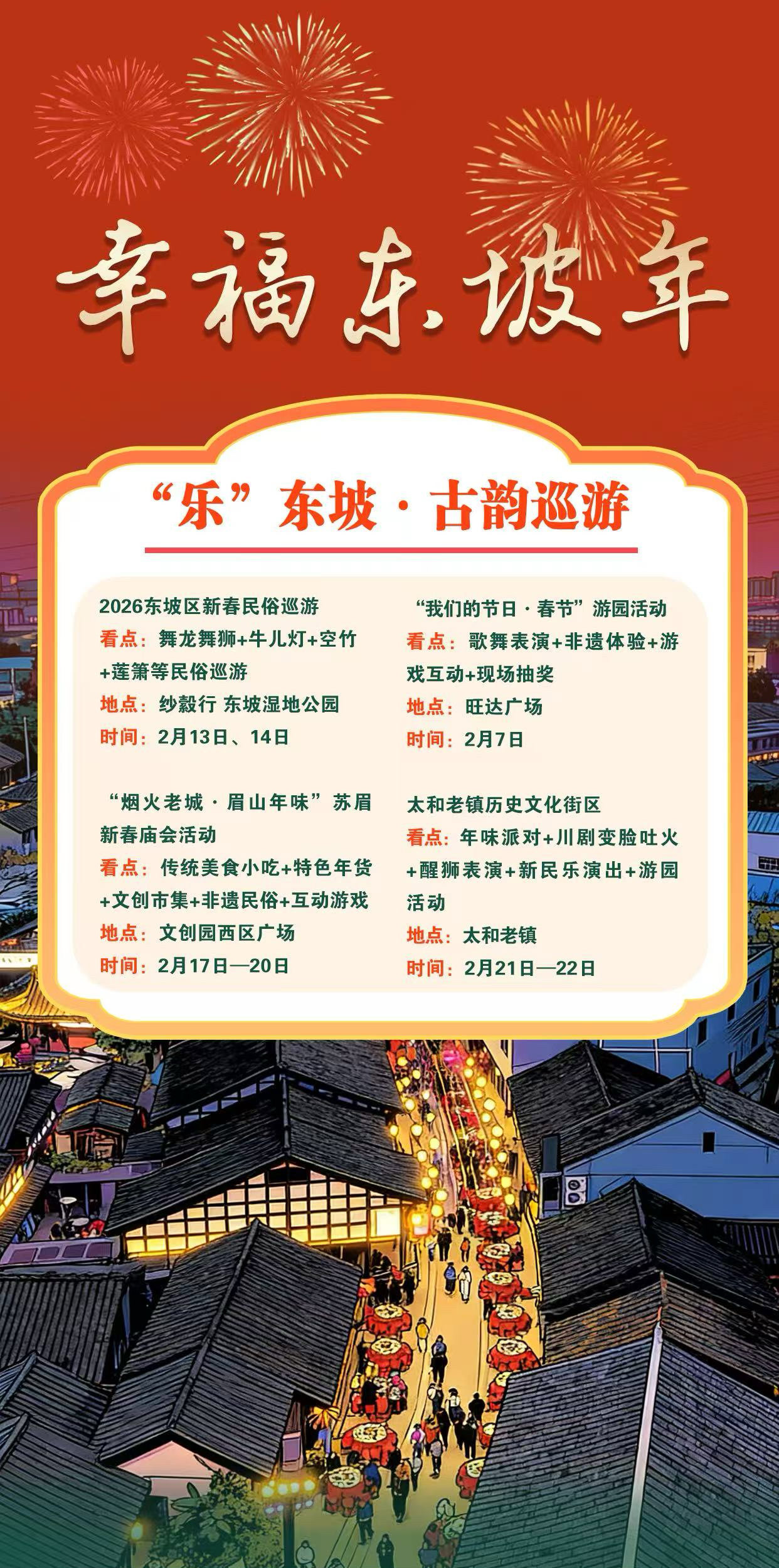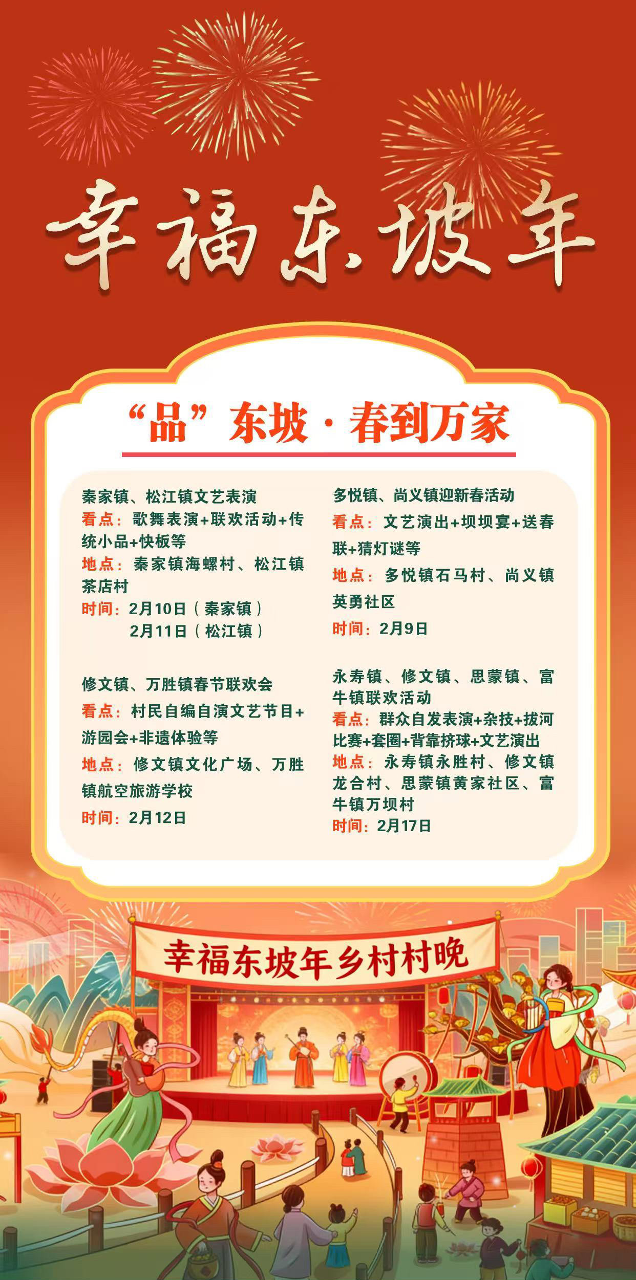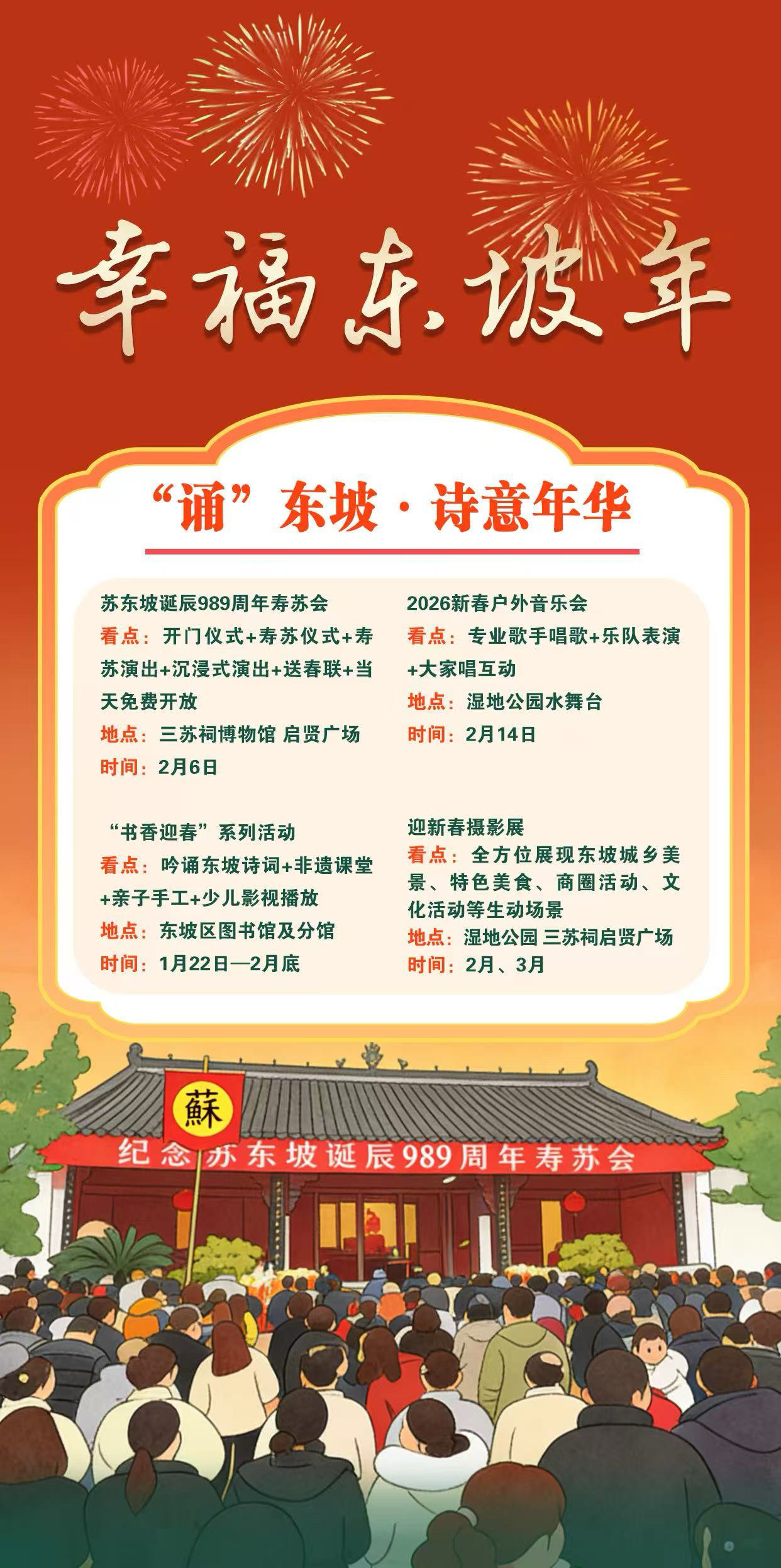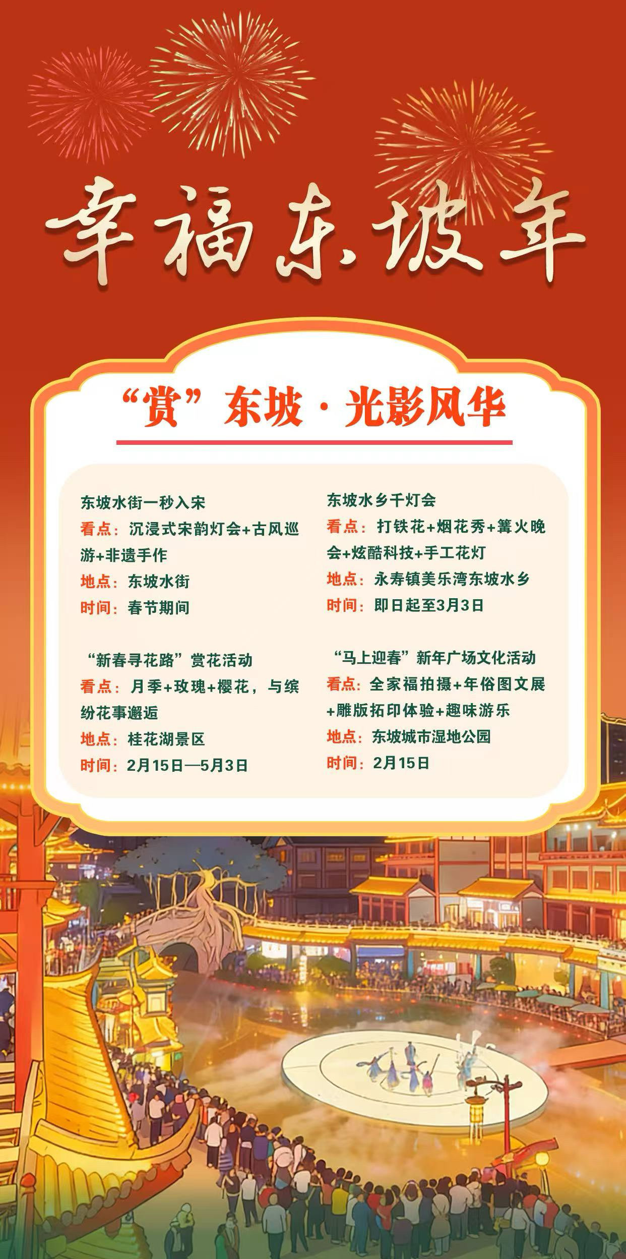 怎么玩?去哪儿玩?四张海报,一目了然。今年春节,来东坡过个地道团圆年。