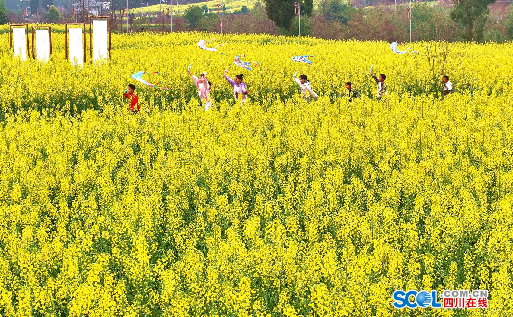 小朋友在眉山市仁寿县青岗乡的油菜花海中玩耍。(潘帅摄)