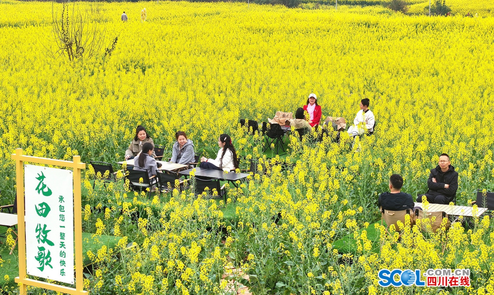 游客在眉山市仁寿县青岗乡的油菜花海里惬意品茶,与好友闲聊日常。(潘帅摄)