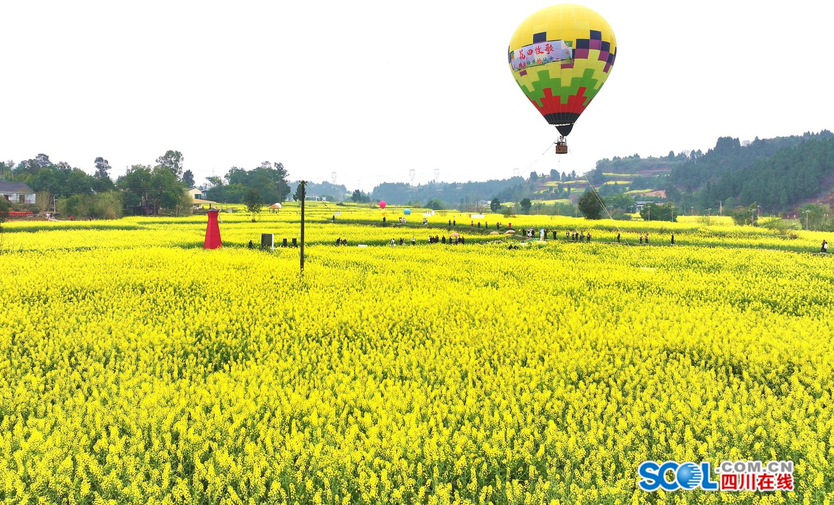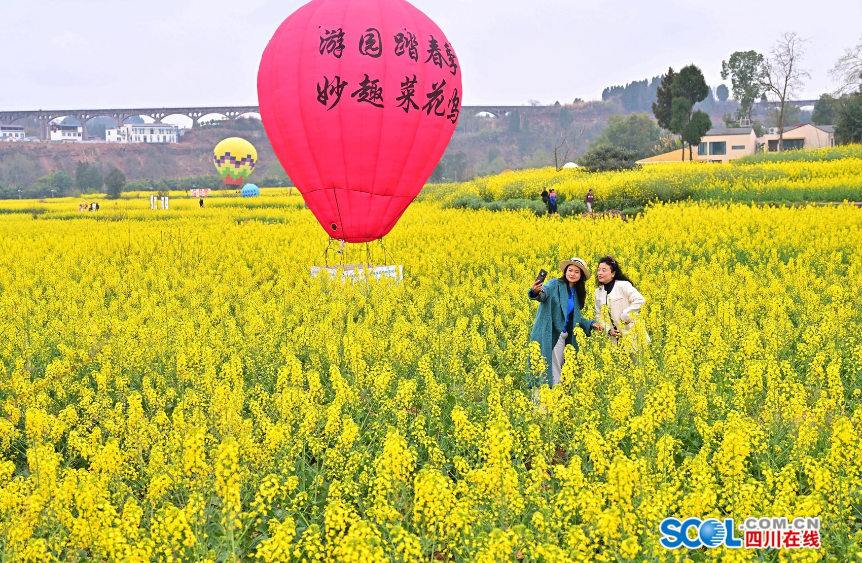 步入花海之中,金黄的油菜花缀满枝头,层层叠叠、连绵起伏。游客们漫步花间小径,有的举着相机,定格美好,有的在花海里惬意地品茶,与好友闲聊,有的大胆体验低空热气球项目,换一种视角俯瞰花海……