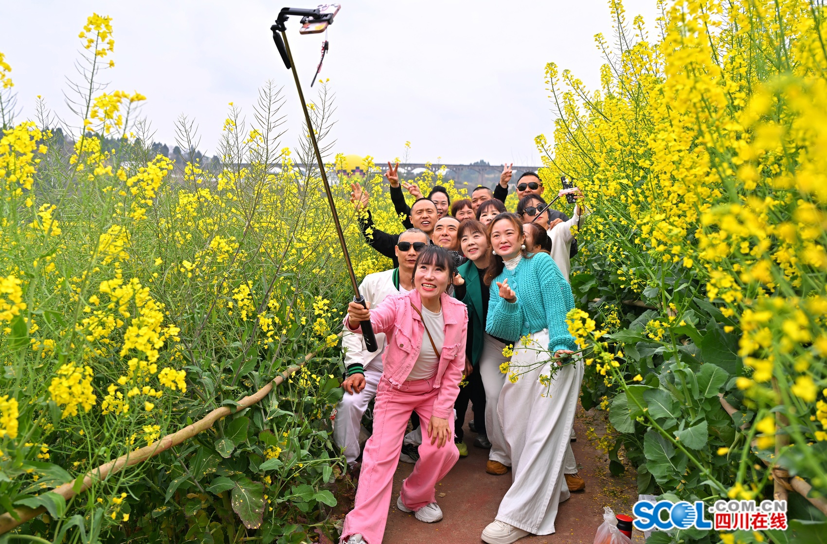 游客在眉山市仁寿县青岗乡油菜花海中赏花拍照。(潘帅摄)