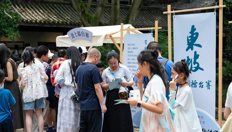 4月4日至6日,每日13:30—17:00,三苏祠晚香堂举行诗词擂台赛。采用“科举进阶”模式,设“秀才-举人-进士”三级答题闯关,每过一关获对应等级文创。参与者还可现场背诵《赤壁赋》《寒食雨》《望江南·超然台作》其中一篇,完整无误即可获赠文创礼品。