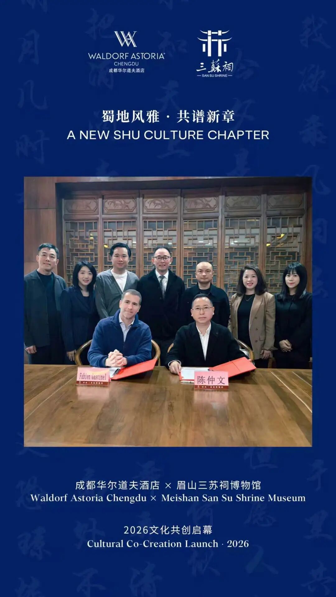 作为东坡故居与东坡文化的起点,三苏祠始终致力于探索千年文脉跨越山海、走向世界的路径;而成都华尔道夫酒店作为城市的“国际客厅”,也在积极探寻向全球宾客展现东方魅力的方式。此次双方携手,正是基于对东坡文化当代价值的共同认可,开启的一场跨越全年的双向奔赴。