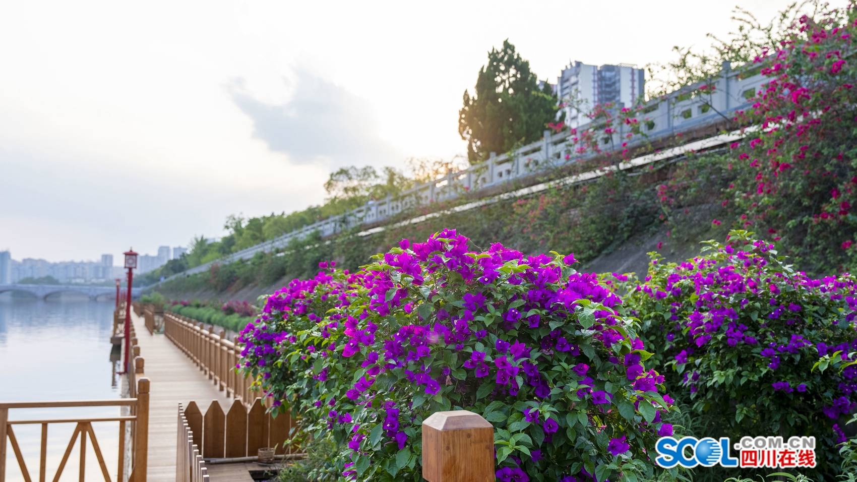 园林景观上,眉山市住建局以“公园城市”理念进行升级打造,在沿途新栽植红花三角梅球538棵、红花三角梅(藤蔓)260棵、紫花三角梅球131棵,打造四季花开的绚丽湖岸线。在白鹭栖息区附近,优化临水观景台布局,增设定制竹钢座凳和凉亭坐凳,方便大家歇息观白鹭。