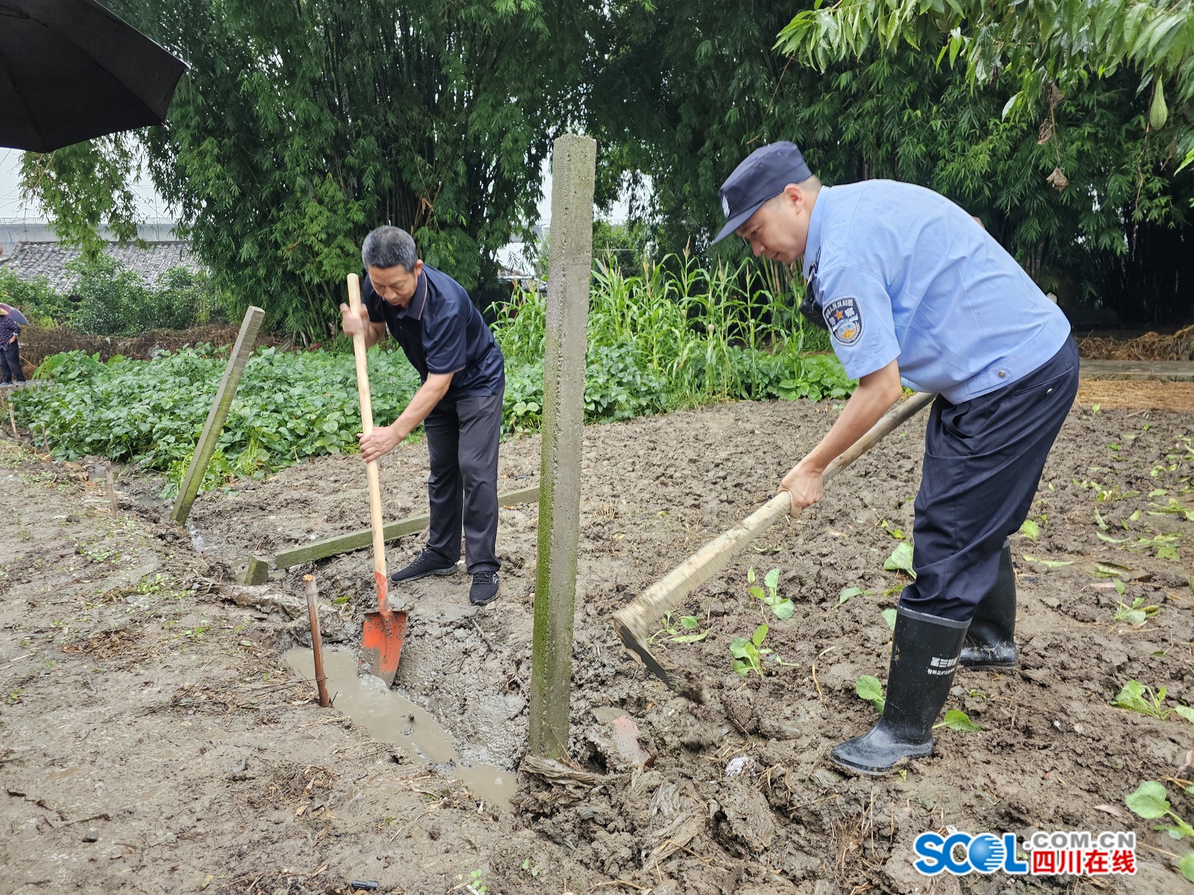 接到报警后,东坡区太和镇派出所副所长杜潇第一时间联动“永和调解队”成员,太和镇司法所所长吴卫国,永丰村老村支书周永久,以及永丰村警务助理张露露。15分钟后,四人冒雨赶到争议地块现场。