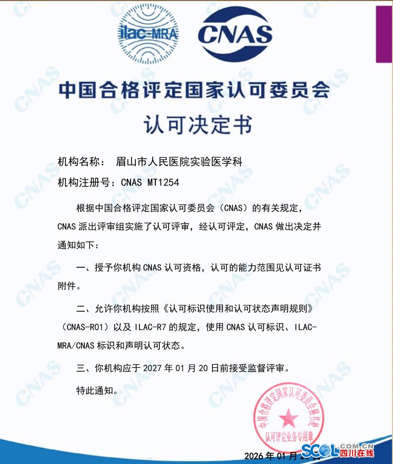 自2023年10月起,眉山市人民医院系统推进认可筹备工作,通过完善质量管理体系、验证仪器试剂性能、开展风险评估、加强临床沟通、优化信息系统、组织全员培训等措施,对检验前、中、后全流程进行了系统性提升。2025年10月,实验室通过CNAS专家组现场评审,并于2026年1月20日正式获颁证书。