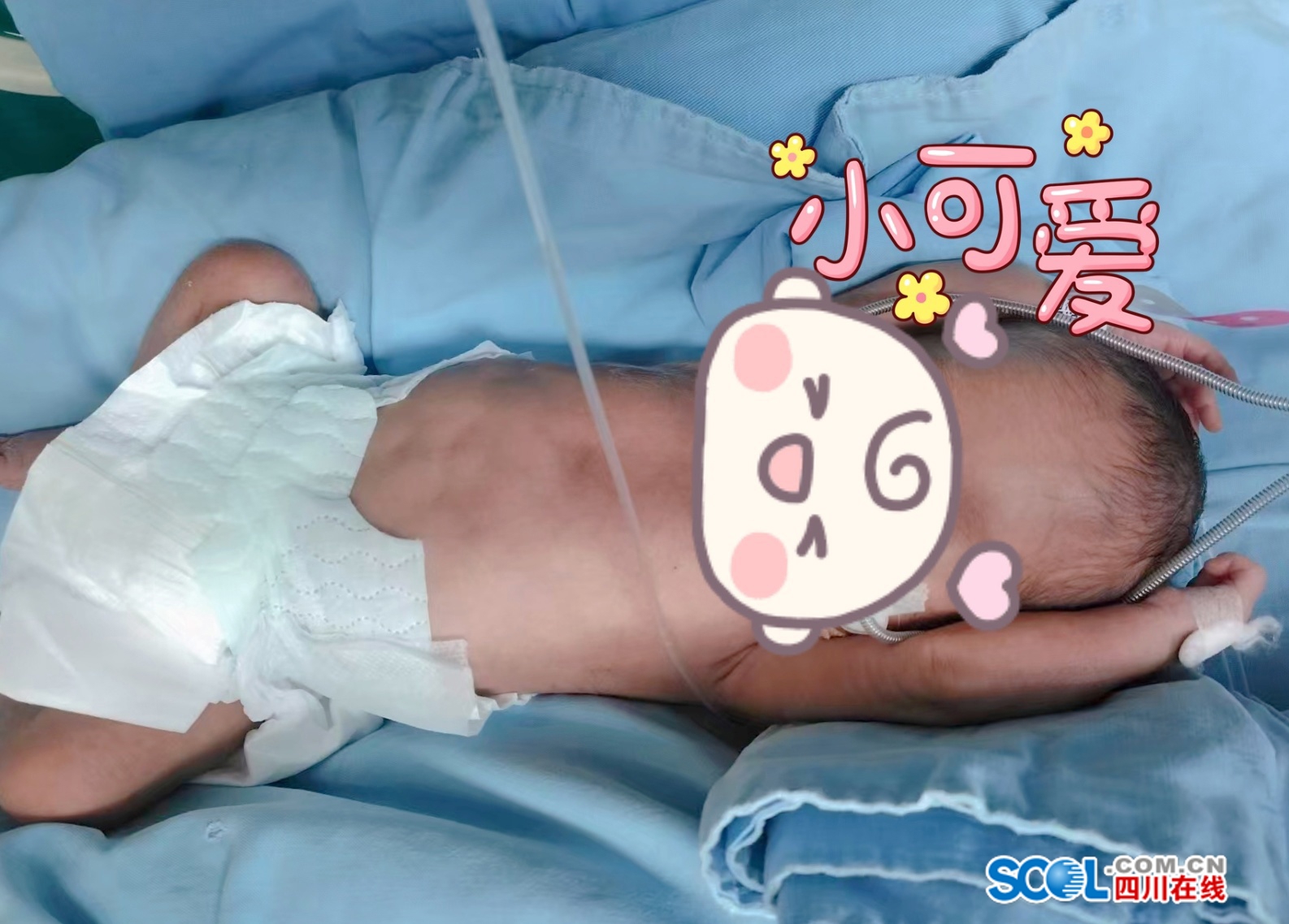小星星在产房顺产出生时,自主呼吸极微弱,反应差,患有最严重的新生儿呼吸窘迫综合征。守候在产房外的医疗团队立即行动,迅速进行气管插管并紧急注入肺表面活性物质,为这个“未发育成熟的肺”争取了宝贵生机。