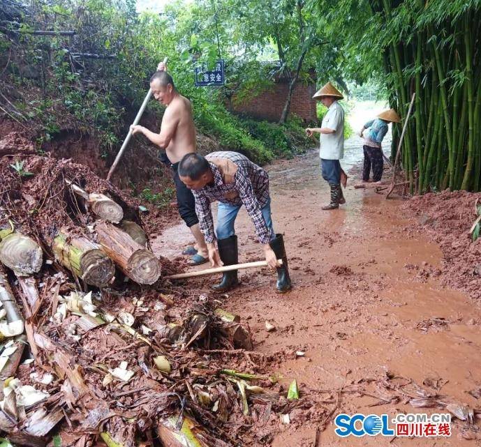 四川在线眉山讯(袁露 温选鹏 记者 王青山 谭笑非)8月18日,在眉山市彭山区江口街道泥湾村,村民刘少林正在和大家一起清理道路上的淤泥。