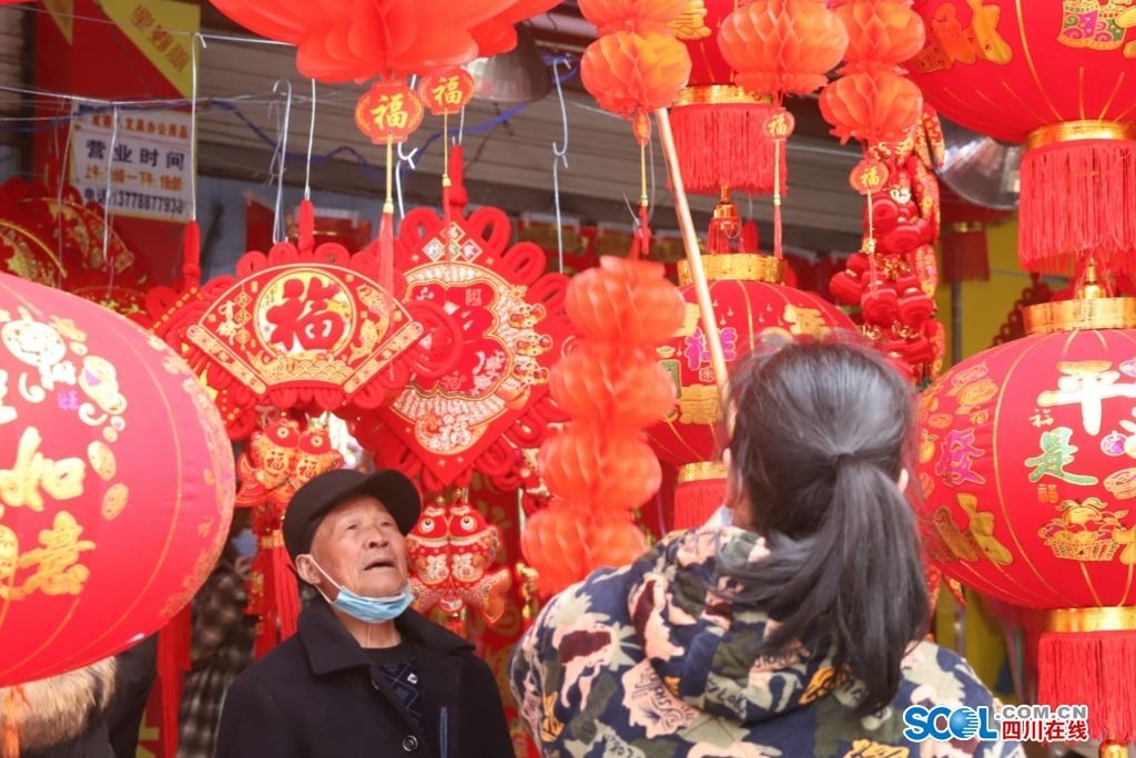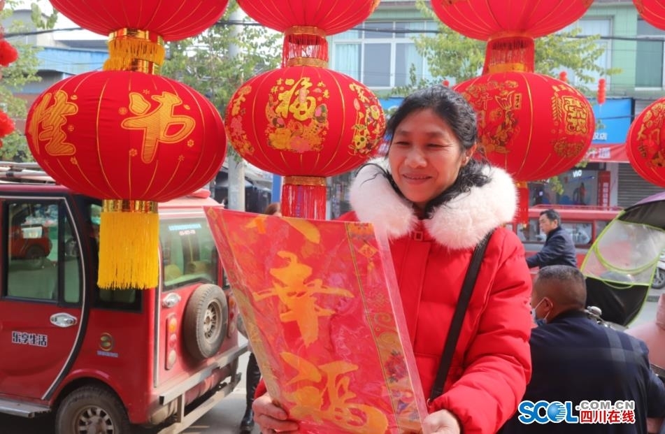 春节将至,生活越来越好的眉山市彭山区城乡群众,纷纷上街选购春联、“褔”字和红灯笼等,准备热热闹闹地过一个吉祥如意的春节。正在选购大红灯笼的观音街道观音铺社区肖纪英大姐说,“社会制度优越,生活越来越好,挂红灯笼的目的,完全是为了用喜庆的方式来体现我们的美好幸福生活。”