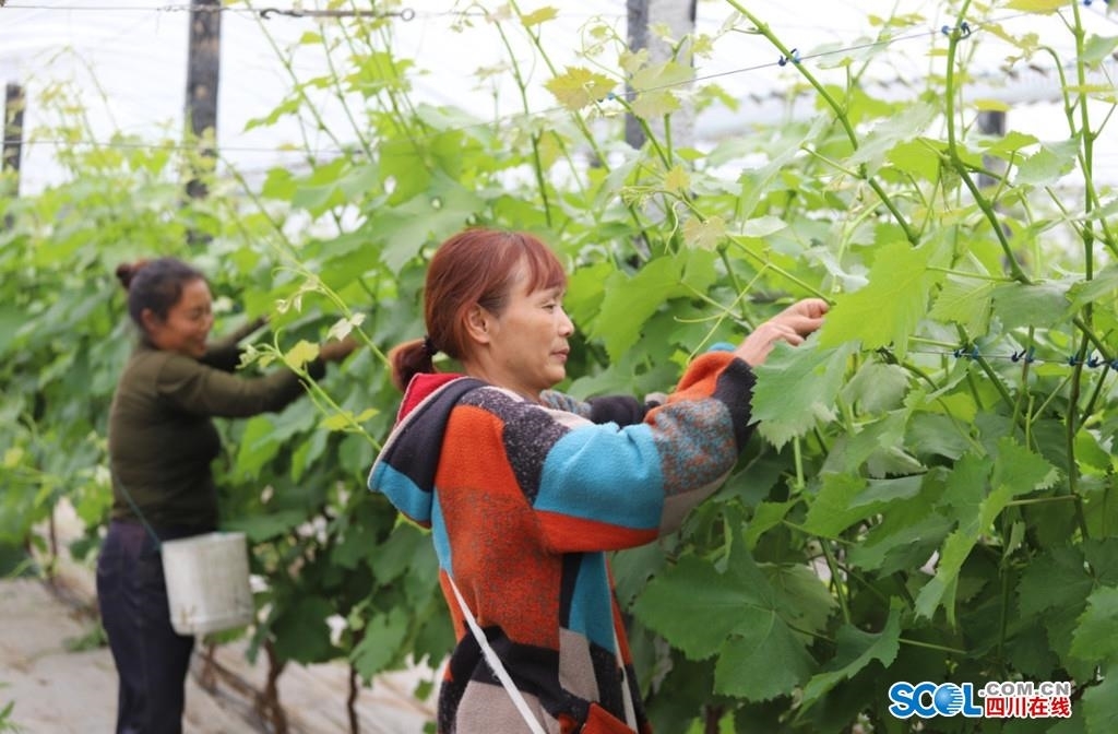 四川在线消息(刘树军 眉山频道 谭笑非)4月5日下午,眉山市彭山区观音街道果园村万亩葡萄园内,村民正在抹芽和绑扎葡萄枝条。