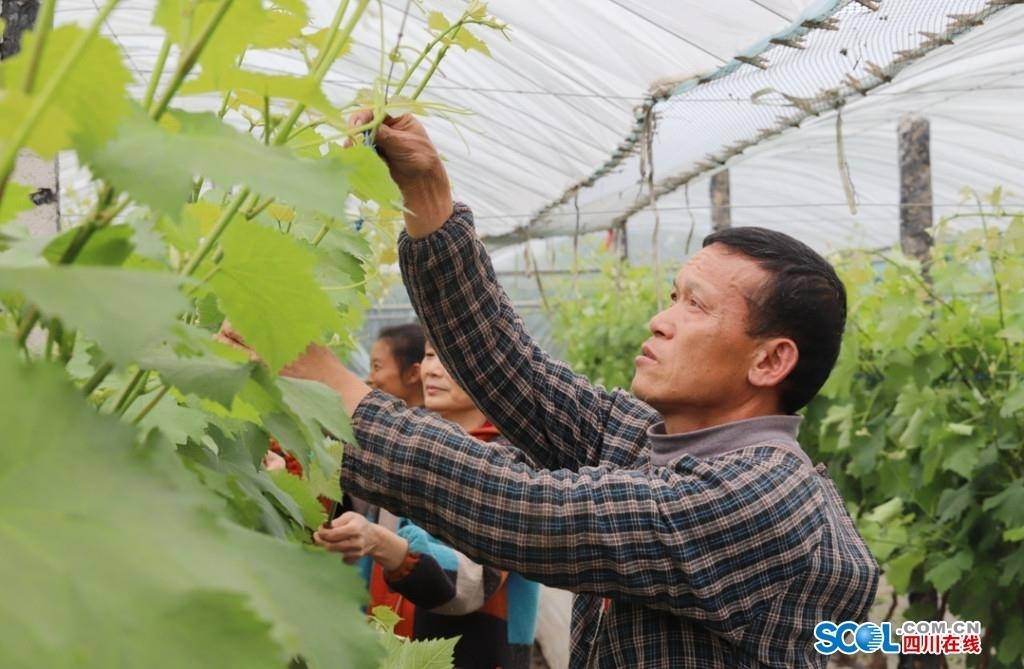 当日,眉山市彭山区观音街道果园村万亩葡萄园内,共有800余名村民在抹芽和绑扎葡萄枝条。