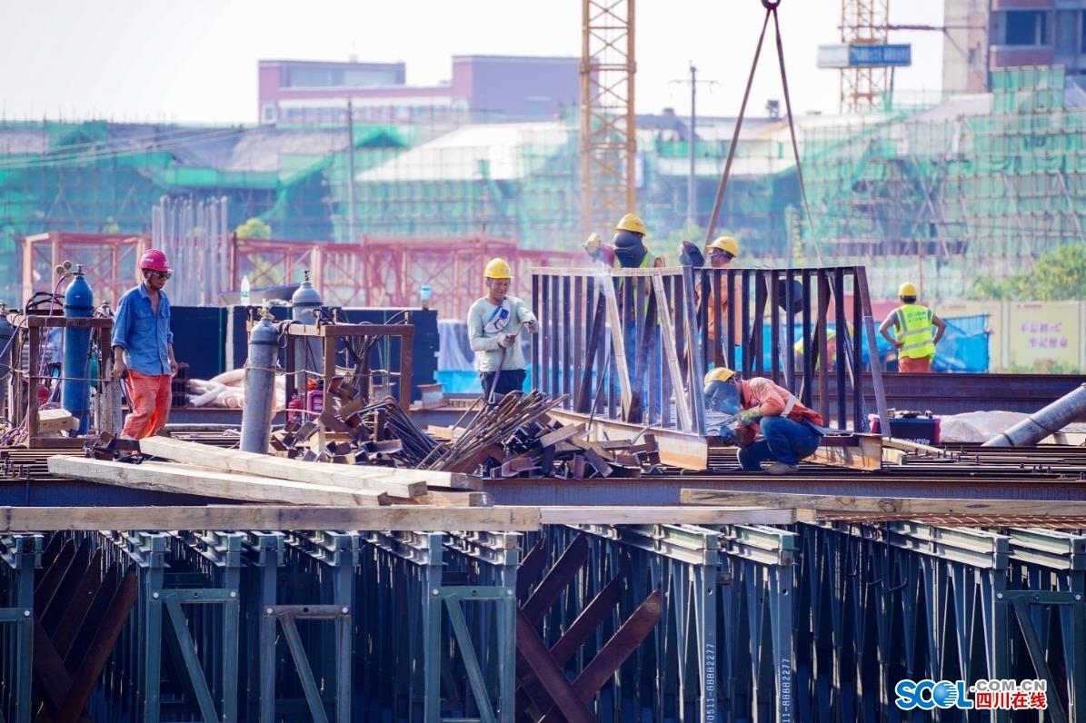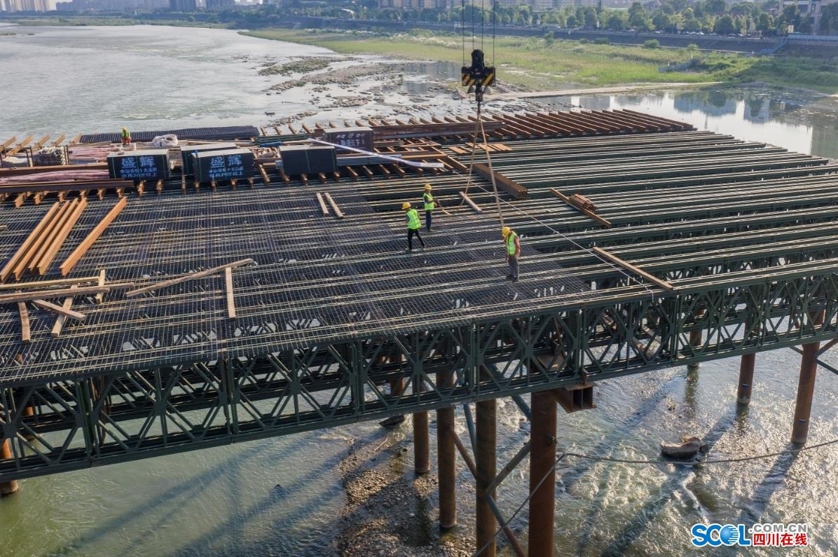 四川在线消息(翁光建 徐磊 眉山频道 谭笑非)足蒸暑土气,背灼炎天光。近日,持续的高温天气对一线作业造成极大的挑战。8月3日,在眉山市彭山区岷江大桥施工现场,工人们正在紧张施工,为保证工期的顺利推进,高温天气下建筑工人们仍然坚守在工作岗位上。