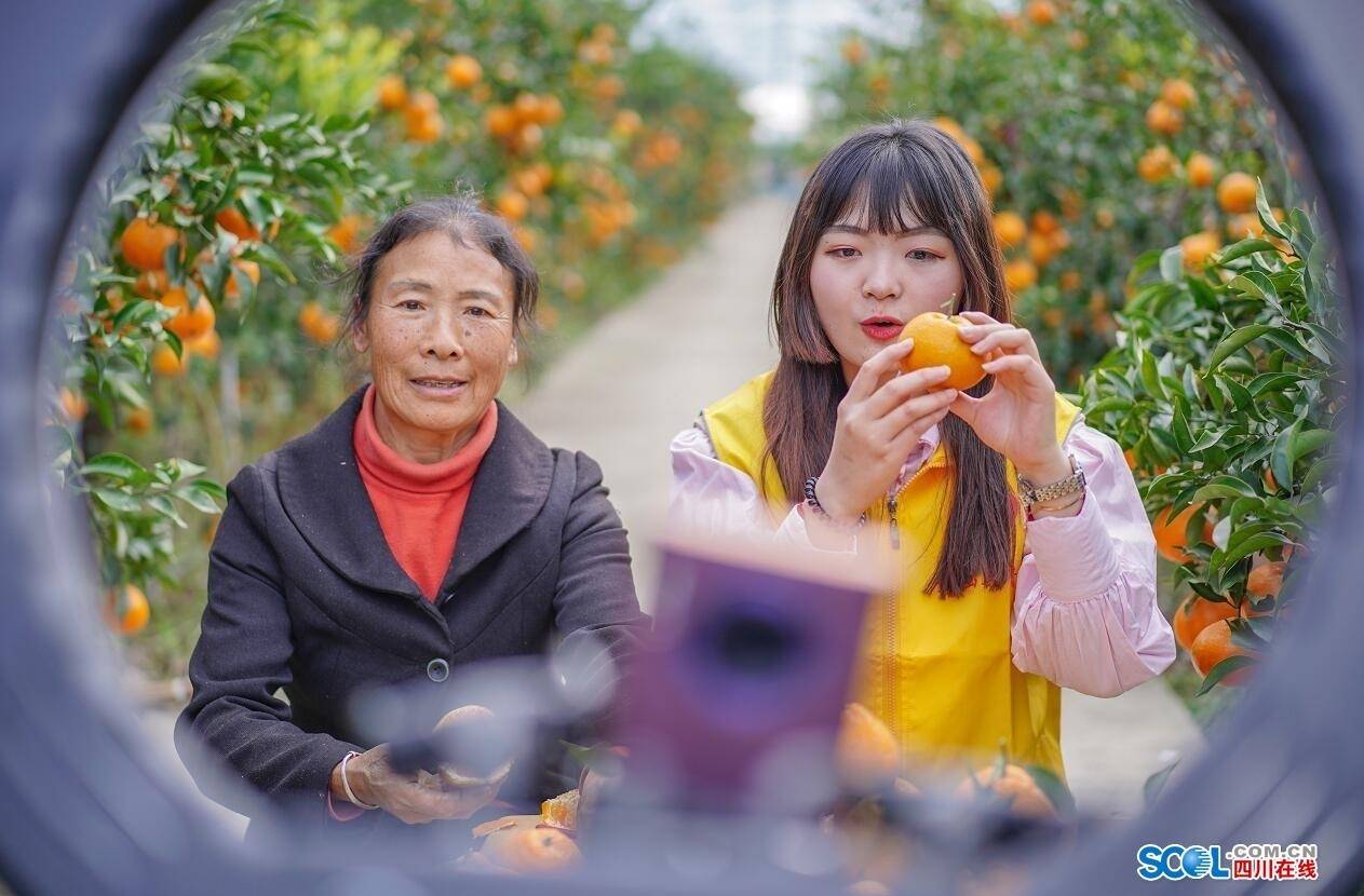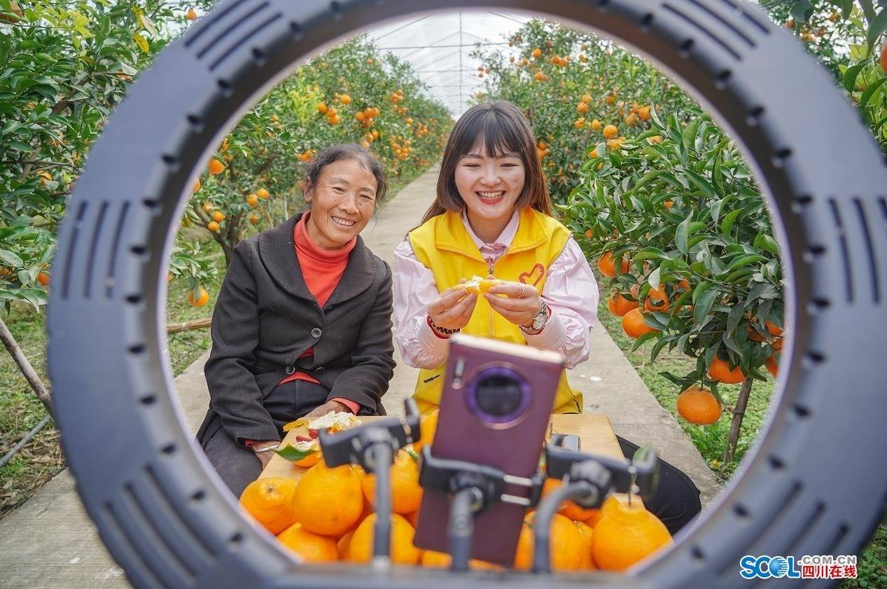 四川在线消息(翁光建 周子悦 眉山频道 谭笑非)12月29日,眉山市彭山区“95后”西部计划志愿者、公义镇兼职团委副书记宋雨庭正在该区公义场社区初心农耕水果家庭农场直播销售柑橘。