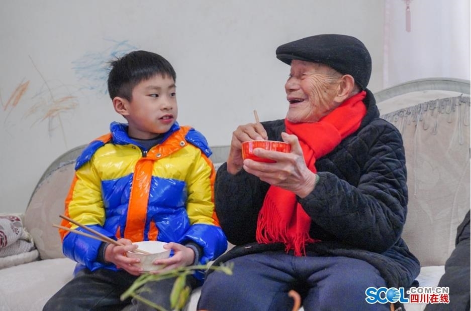 四川在线消息(黄敏 帅佳 眉山频道 谭笑非)“吃汤圆啦!祝大家元宵节快乐!”2月15日,家住眉山市彭山区的百岁老人张绍清一家齐聚一堂,热热闹闹度过一个欢乐的元宵节。