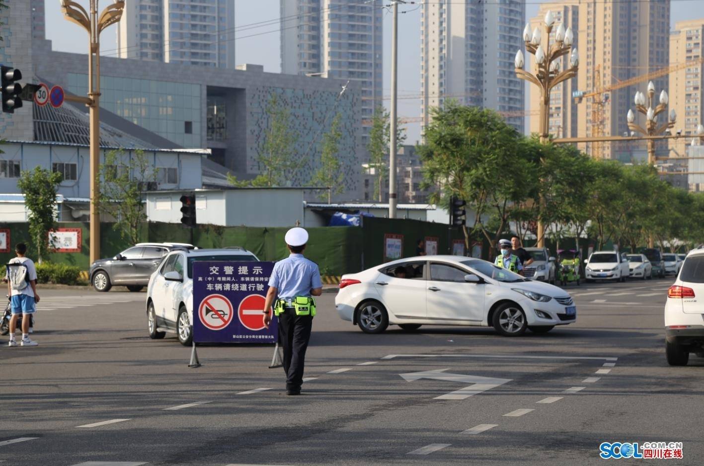 早上7点,彭山公安交警便提前到位,对考场周边的道路进行清场。7点40交通管制时间一到,执勤交警分头行动,在考点外各路口处进行车辆分流,双向设置“禁鸣”“减速慢行”等标志牌,确保考场周边区域安静,减少对考生的噪音干扰。
