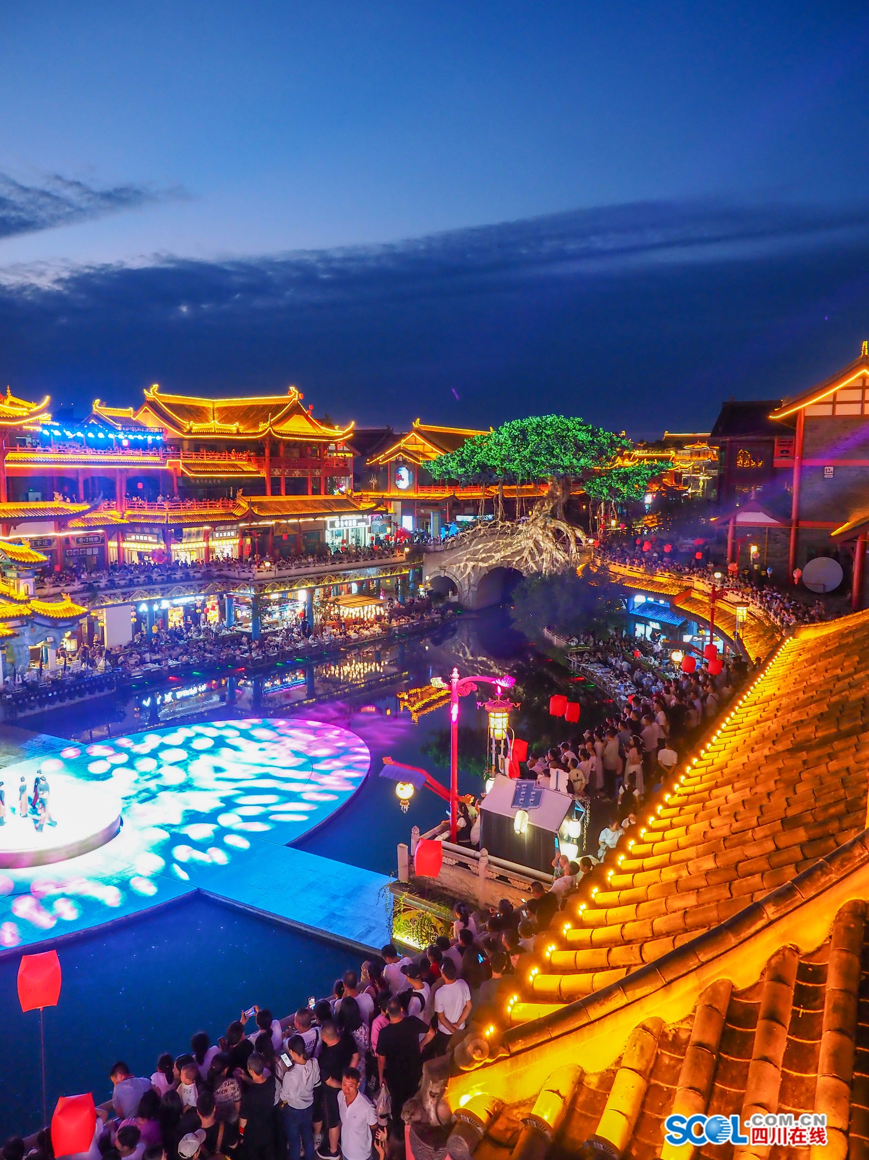 夜幕降临,东坡岛穿越盛世水街灯火璀璨。由东坡区与腾讯公司联合打造的“无忧城・大宋奇妙夜”沉浸式互动演艺,获游客青睐。数据显示,8天水街累计接待游客46万人次。