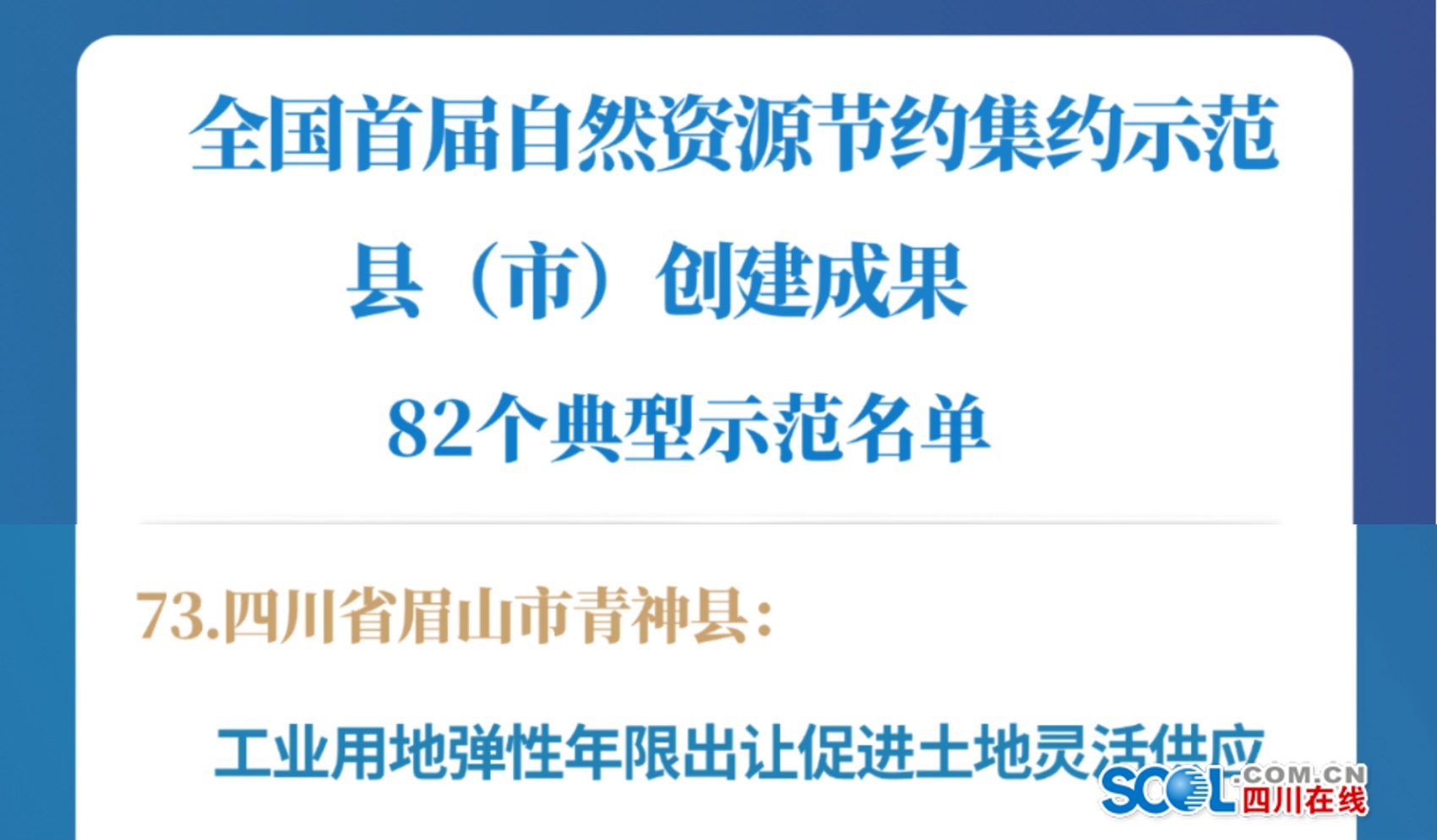 四川在线消息(卿萱 川观新闻眉山频道 邹钰)1月13日,川观新闻从青神县委宣传部获悉,近日,全国首届自然资源节约集约示范县(市)创建成果正式发布,82个县(市)脱颖而出,青神县凭借《工业用地弹性年限出让促进土地灵活供应》典型案例成功入选,成为全省唯二、全市唯一获此“金字招牌”的区县。