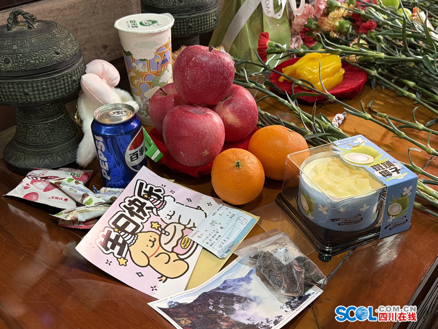 袁菲阳的礼物并非个例。今年的“寿苏会”上,年轻人带来的“寿礼”充满创意与温度:一瓶贴着“这个可乐可好喝了你可以尝一下”字条的可乐、一块精心包装的巧克力和饼干、一张明信片、一包荔枝味的软糖……这些当代年轻人喜爱的东西,成了连接古今的温情纽带。