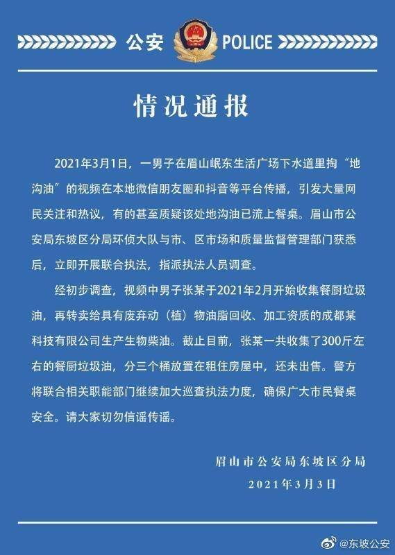四川在线消息(眉山频道 白杨)3月3日,眉山市公安局东坡区分局发布情况通报:2021年3月1日,一男子在眉山岷东生活广场下水道里掏“地沟油”的视频在本地微信朋友圈和抖音等平台传播,引发大量网民关注和热议,有的甚至质疑该处地沟油已流上餐桌。眉山市公安局东坡区分局环侦大队与市、区市场监督管理部门获悉后,立即开展联合执法,指派执法人员调查。