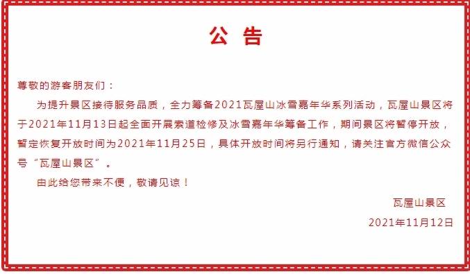 四川在线消息(眉山频道 姚粼)11月12日,记者从洪雅县瓦屋山景区获悉,为提升景区接待服务品质,全力筹备2021瓦屋山冰雪嘉年华系列活动,从11月13日起,瓦屋山景区将全面开展索道检修及冰雪嘉年华筹备工作,期间景区将暂停开放。