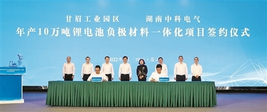5月13日,甘眉工业园区与湖南中科电气年产10万吨锂电池负极材料一体化项目签约仪式举行。(雷同 摄)