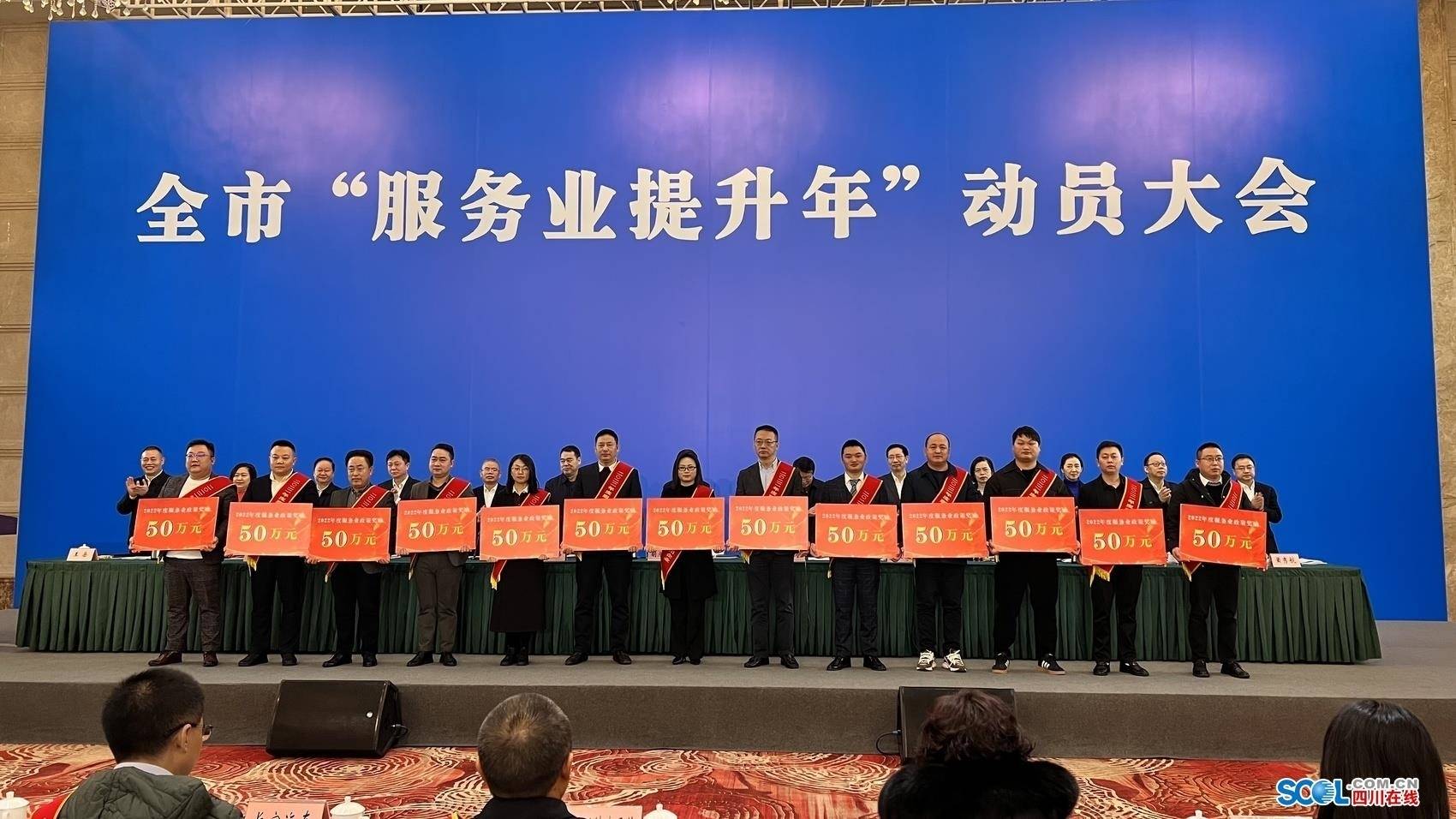 为树立榜样、表扬先进,在2月13日的动员大会上,市政府对四川大泽绿科贸易有限公司等100家2022年度服务业贡献突出企业予以通报表扬,并现场为相关企业代表授牌、兑现政策奖励。
