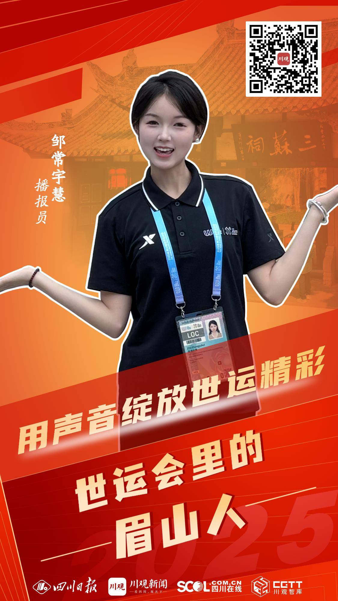 “获得金牌的是!中国!龚莉!”作为成都世运会现场播报员,东坡区姑娘邹常宇慧清亮而充满力量的声音穿透比赛现场沸腾的声浪,将这场体育盛典的每一刻心跳同步传递到世界各个角落,让世界听到来自成都世运会的“眉山声音”!