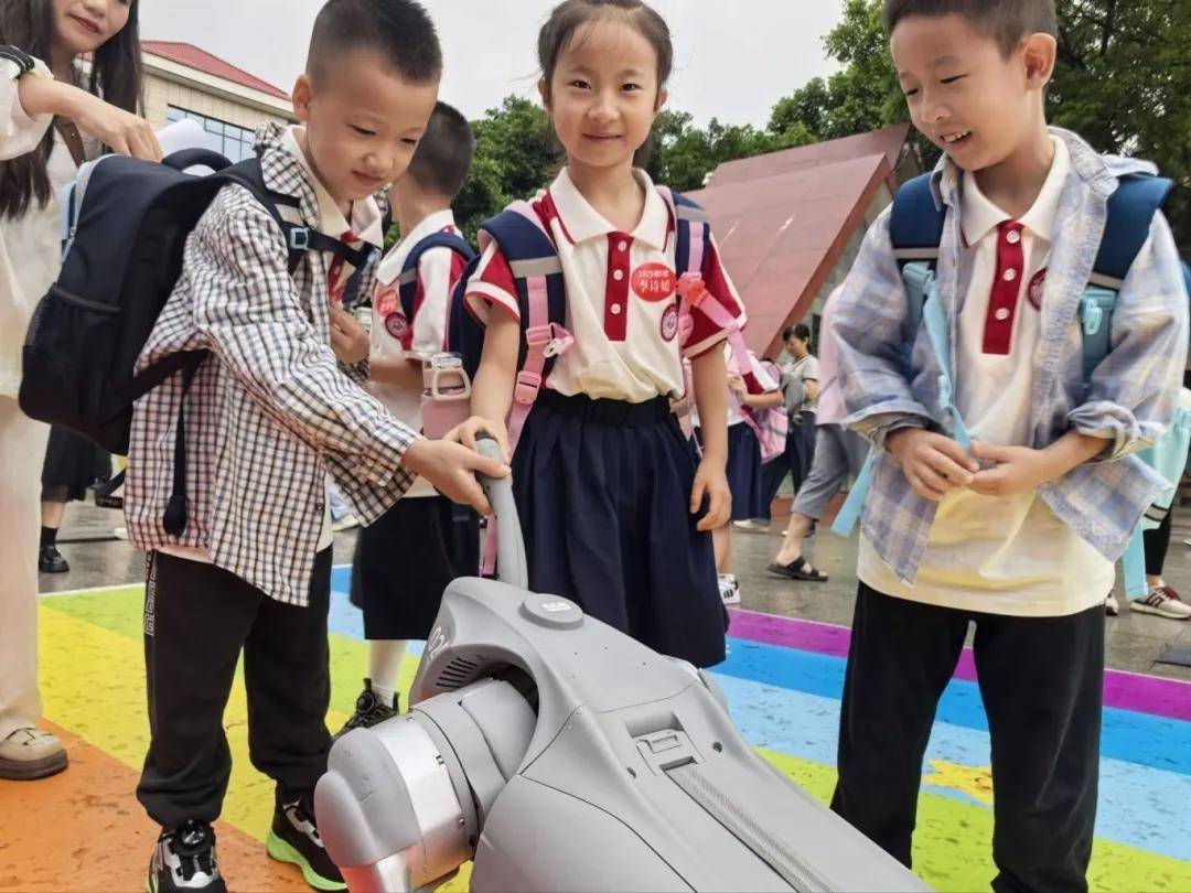眉山市第一小学校门口,智能机器狗“笨笨”成为全场焦点——它一会儿热情地与小朋友握手,一会儿俏皮地比心,还表演了旋转、跳跃等酷炫特技。更让同学们兴奋的是,校园里还设置了多个机器人互动打卡点,一年级小“萌新”们与各式机器人趣味互动,玩得不亦乐乎。