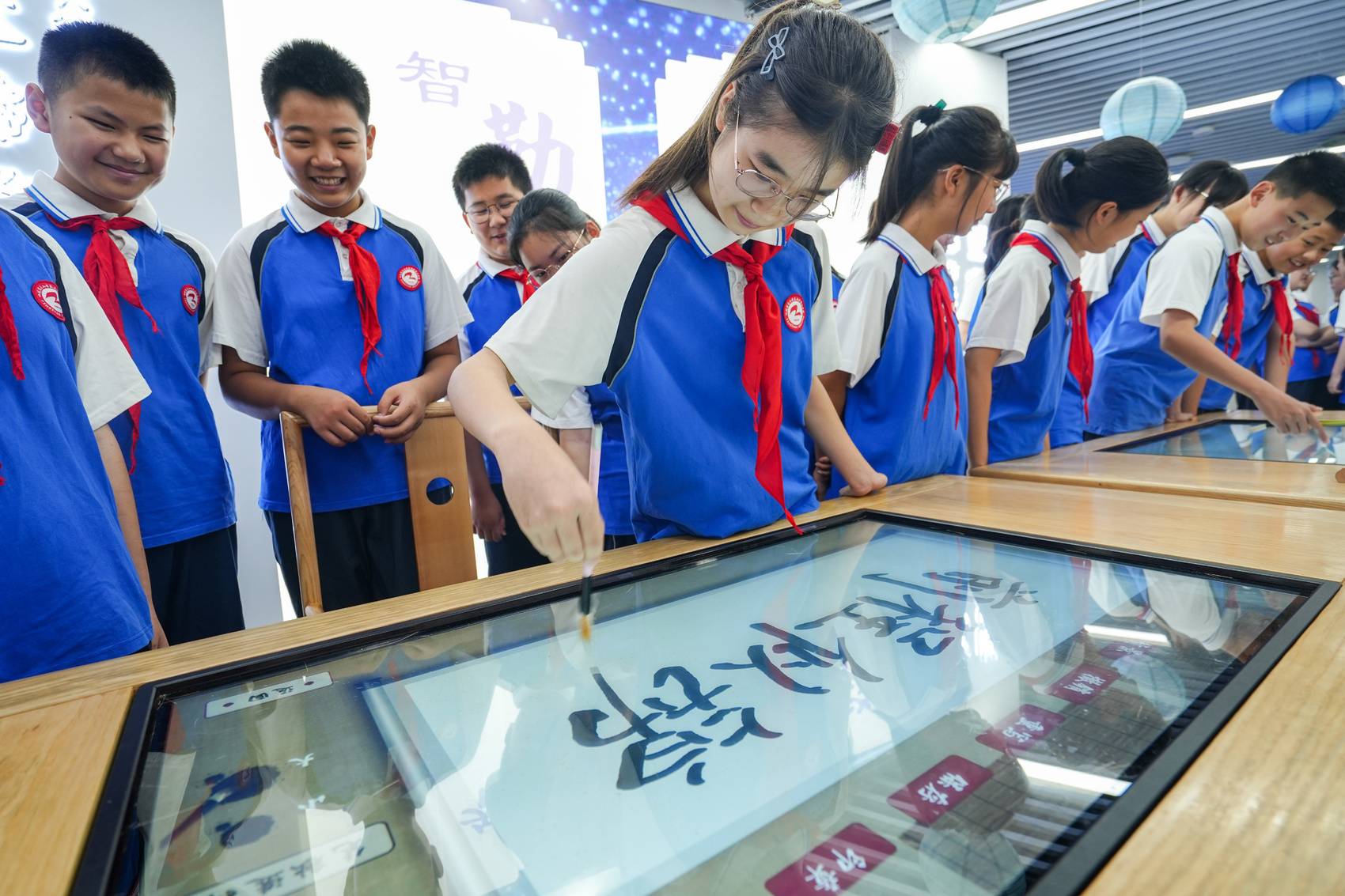 电子书法屏、智能棋桌、沉浸式VR互动机,还有机器馆员前来打招呼……开学第一天,彭山区第二中学的学生来到区图书馆感受科技魅力。除了亲身体验如何利用自助图书检索平台快速查找书籍、如何通过自助借还设备便捷地借阅和归还图书外,学生们还分享了“如何通过持续阅读与思考实现成长”的案例。