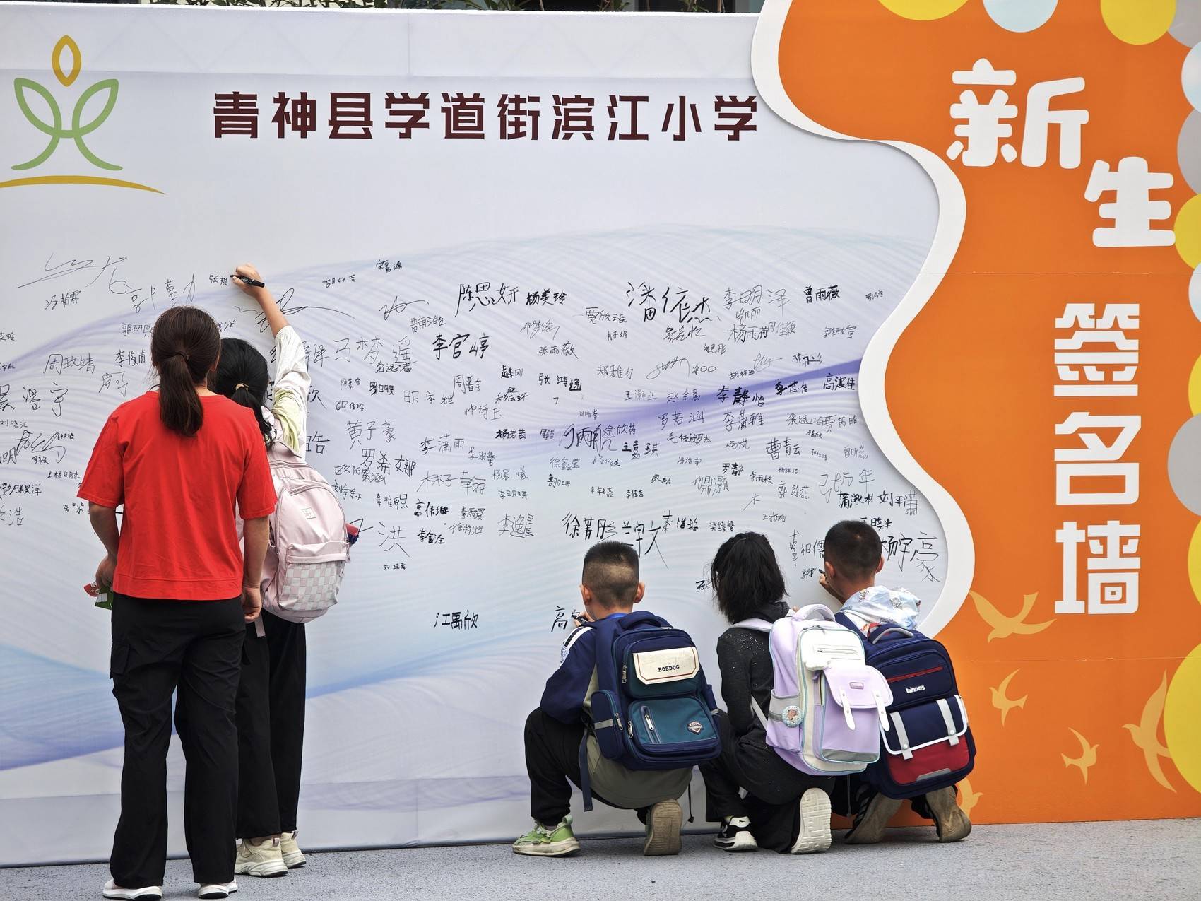 一大早,一年级的新生们带着好奇与期待,在爸爸妈妈的陪伴下,穿过寓意深刻的“三美”通道,迈过象征着新起点的“三美”门廊,步入崭新的小学生活。二至六年级的同学们在签名墙上一笔一画地写下自己的姓名,许下对未来的奋进之约。
