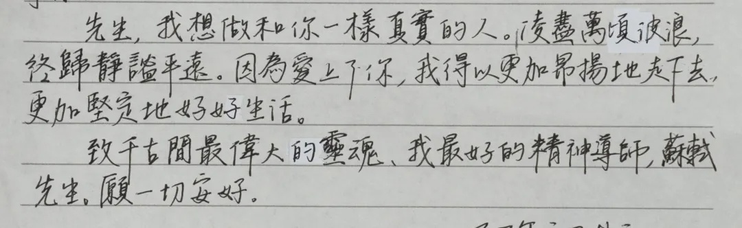 另一封繁体字信,出自一位坚定选择文科的年轻人。曾为抉择焦虑的他,在东坡的文字中找到自我,立下“为天地立心”的梦想,只求做和东坡一样真实的人。