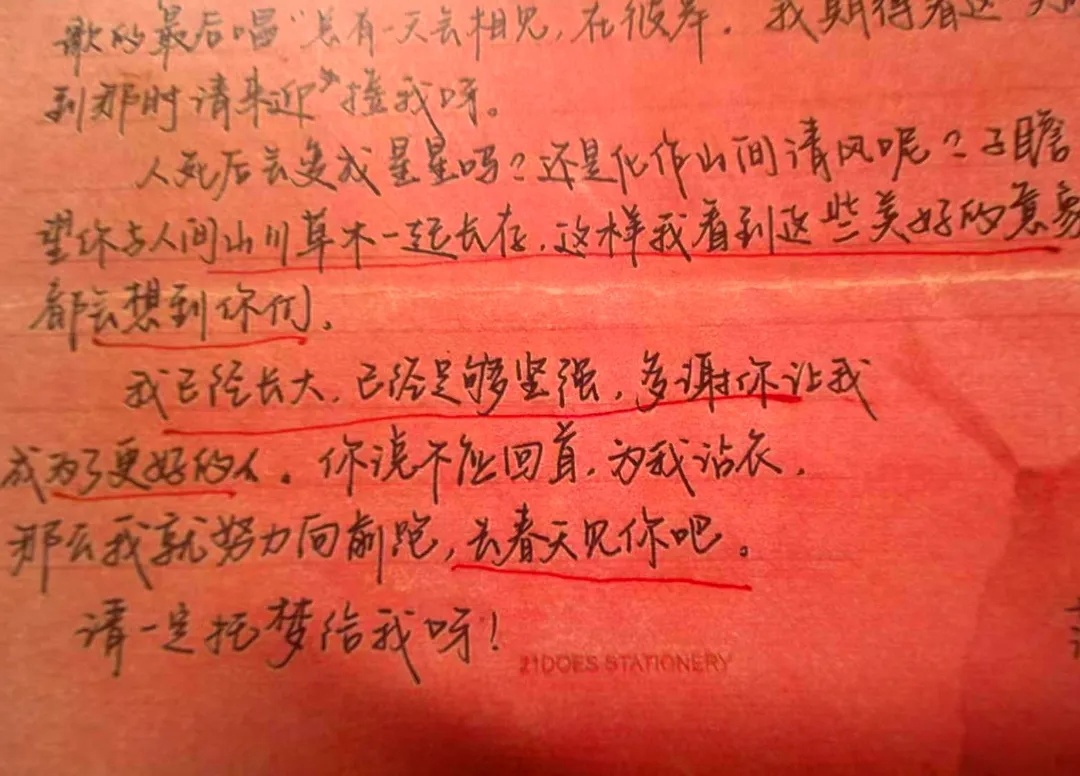 “我已经长大,已经足够坚强,你说‘不应回首,为我沾衣’,那我就努力向前,去春天见你。请一定托梦给我。”