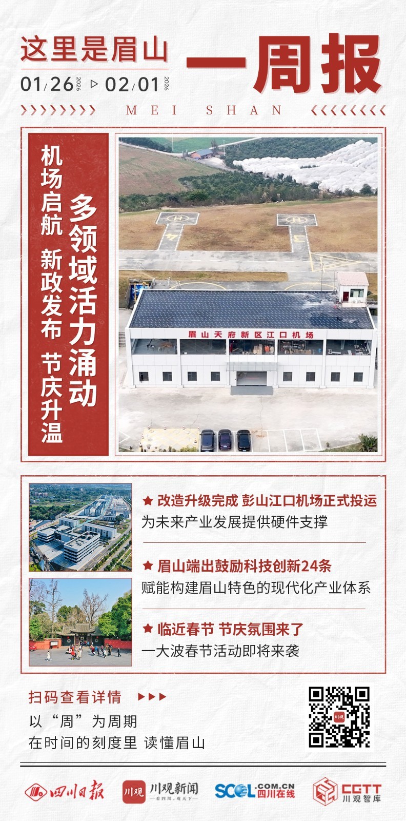 彭山江口通用机场改造升级后正式投运,为未来产业发展提供硬件支撑;促进“两新”融合、发展新质生产力的若干政策出台,明确创新激励方向;临近春节,东坡诞辰纪念活动预热、非遗英歌舞来袭、电商年货节火热进行,整座城市洋溢着浓厚的节庆氛围与经济活力。
