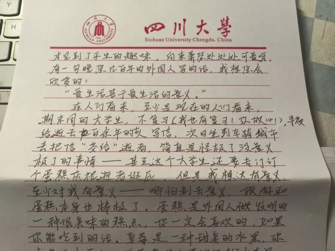 这封信是拿四川大学的信笺纸写的。写信的人说,快要期末考试了,大家都在熬夜复习,自己却熬夜给先生写信,还坐上火车、订了草莓蛋糕,来三苏祠给东坡庆生。