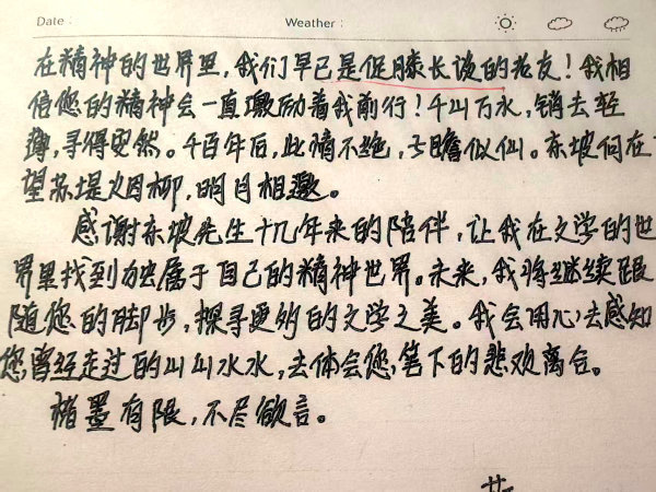 这些信里,没有艰深的理论,只有最直接的触动。有人抄录《定风波》全词,附言“这首诗用了十年才懂”;有人画了一幅简笔画,是“夜饮东坡醒复醉”的憨态;有人“讨厌”东坡诗词的难背,但背得越多却开始越喜欢……纯粹的爱慕,言语往往简单和直接——因为你,我的人生有了光。