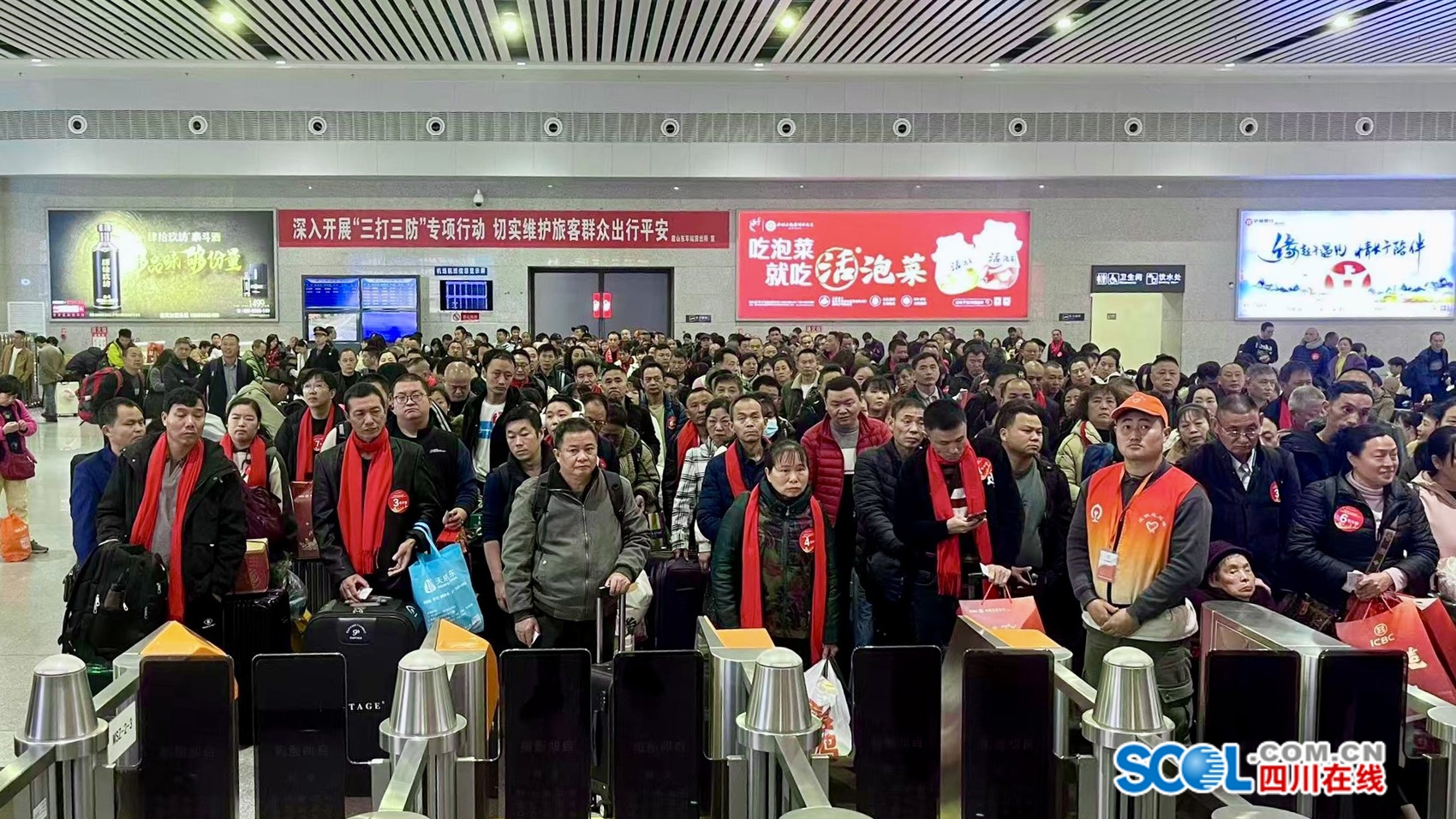 3月2日,正值农历正月返岗复工高峰期。当天上午9点半,340名来自东坡区、彭山区、仁寿县、丹棱县等各区县的眉山籍外出务工人员,戴着红围巾,提着行李和家乡特产陆续通过眉山东站绿色通道进站候车、检票登车。