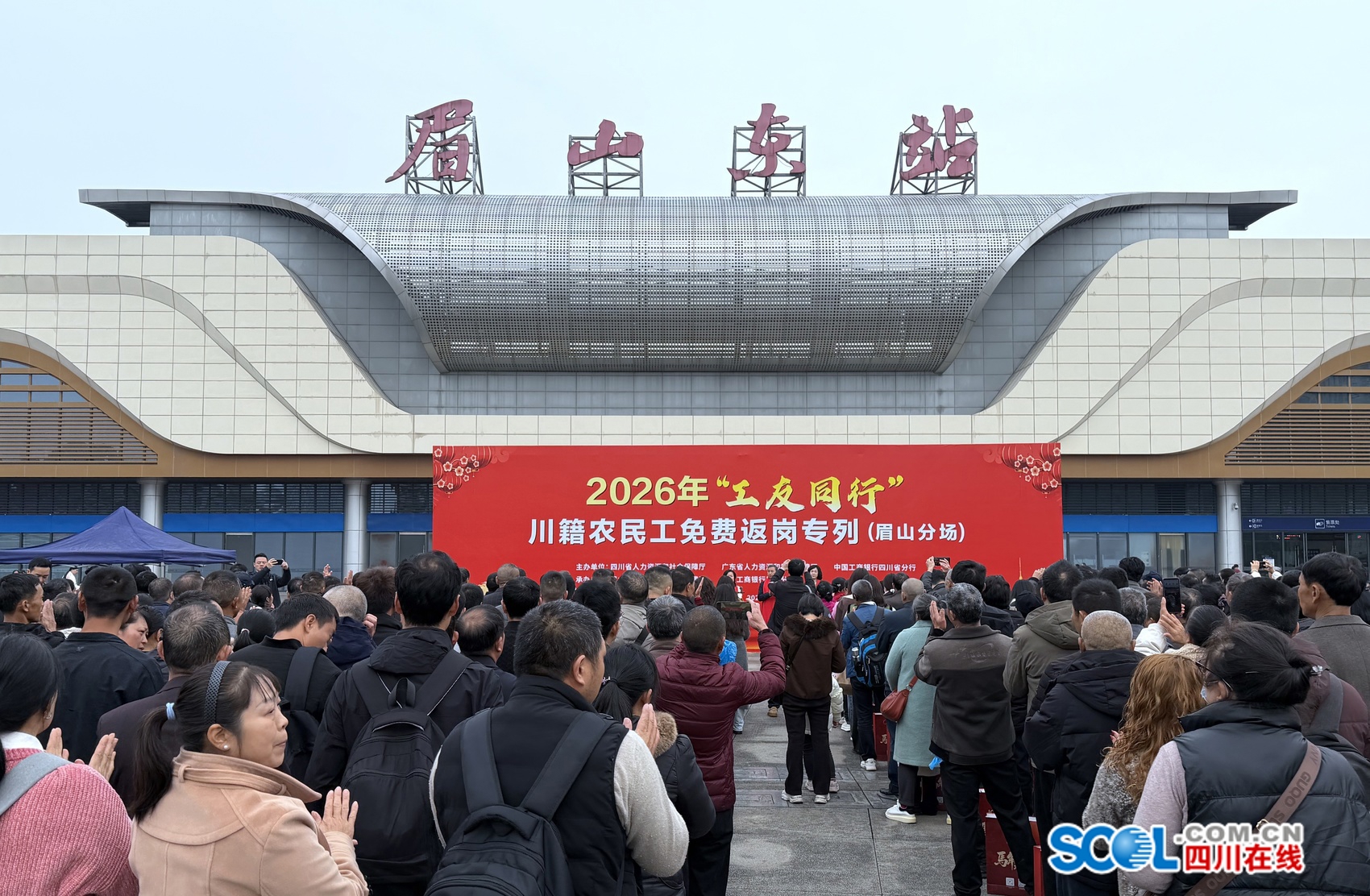 临行前,眉山市人力资源和社会保障局举办了2026年“工友同行”川籍农民工免费返岗专列(眉山分场)送站仪式,现场为眉山籍农民工派发了爱心伴手礼,包含水杯、雨伞、围巾和午餐券等物品,希望给外出务工的家人提供家乡的温暖。