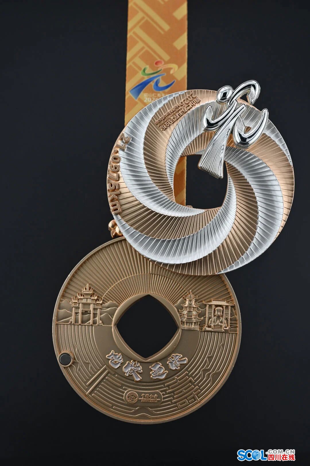 完赛奖牌正面,以白金与玫瑰金双色调线条交织勾勒。