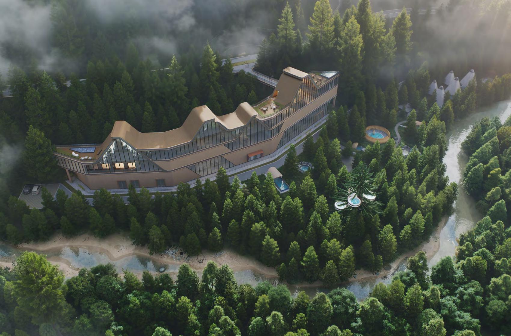 计划2027年春节前后开放。项目依托得天独厚的深层地热资源,共设21个泡池,涵盖室内、室外两大区域,汤泉馆建筑面积约3500㎡,温泉区占地约4270㎡,可同时容纳约616人康养休憩。